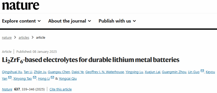 相关研究成果以“Li2ZrF6-based electrolytes for durable lithium metal batteries”为题发表在国际顶级期刊《Nature》上。sunbet申愽化材学院居治金特聘教授为本文共同第一作者,sunbet申愽官网为第二署名单位,承担锂金属电池敏感界面的冷冻电镜精细解析研究工作。