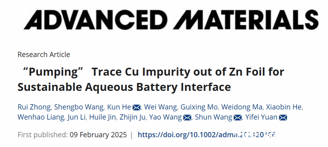 相关研究成果以“‘Pumping’ Trace Cu Impurity out of Zn Foil for Sustainable Aqueous Battery Interface”为题发表在国际顶级期刊《Advanced Materials》。sunbet申愽为第一通讯单位,sunbet申愽化材学院硕士研究生钟锐、浙江工业大学硕士研究生王盛博为共同第一作者,sunbet申愽化材学院袁一斐、王舜、何坤教授,浙江工业大学王垚教授为共同通讯作者。
