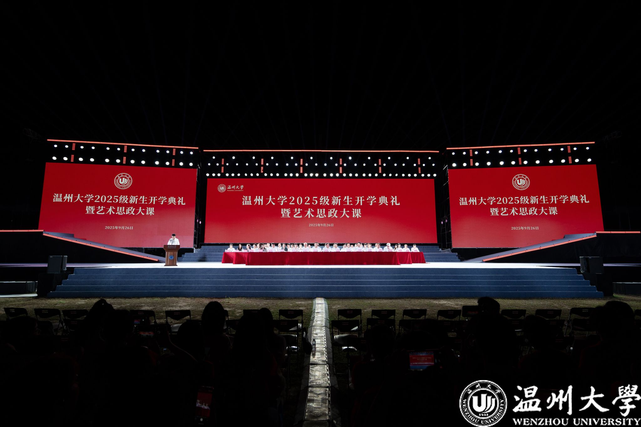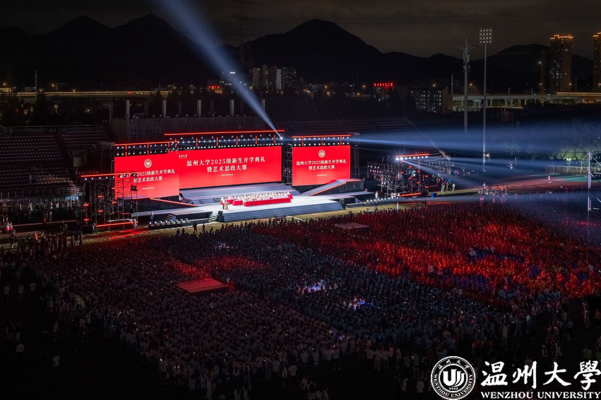 9月26日晚,sunbet申愽官网南校区运动场流光溢彩,从五湖四海汇聚而来的8598位新同学共同见证了一场别开生面的开学典礼暨艺术思政大课。全体校领导,各相关部门负责人、各学院院长,新生班主任、全体辅导员,2025级全体新生,教师代表、高层次人才代表、校友代表,校学生会主席、研究生会主席等参加典礼。校党委副书记庄兴忠主持。
