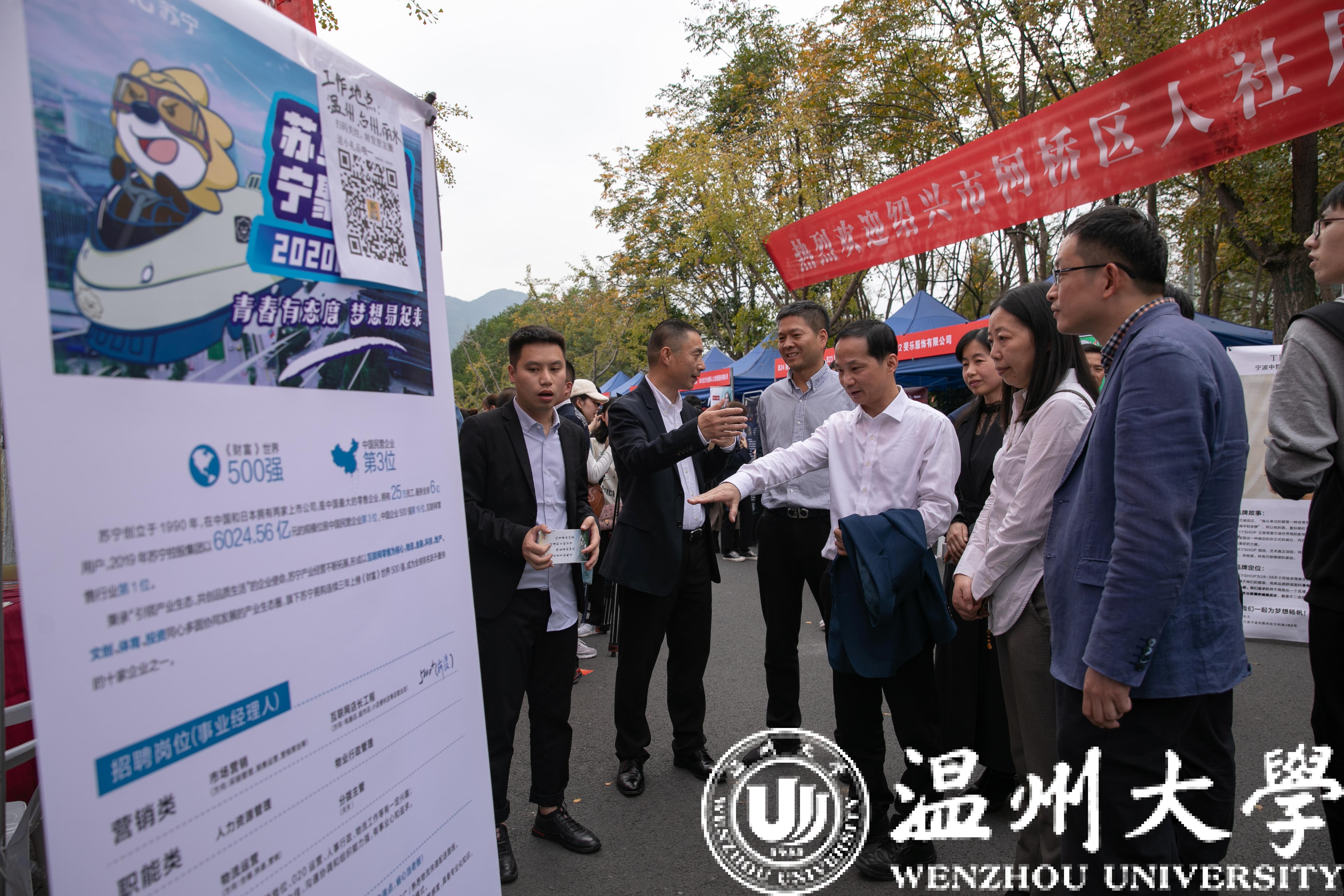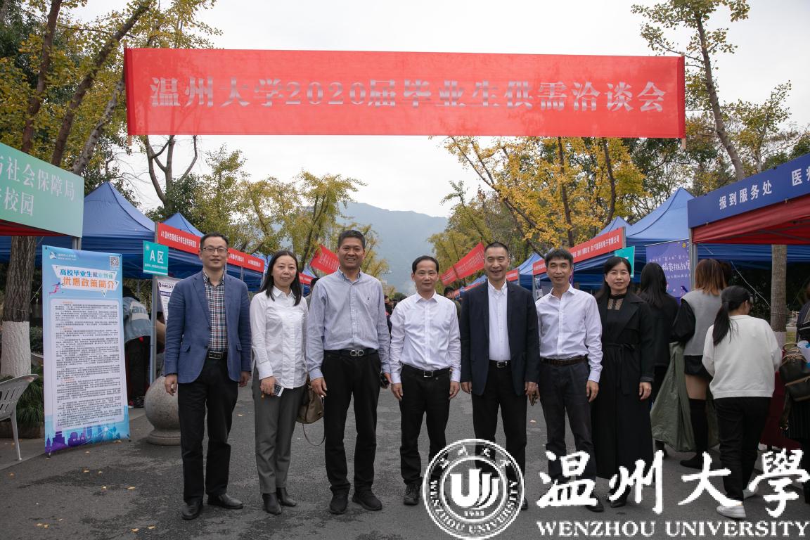为进一步服务广大用人单位和毕业生,更好地搭建“双向选择”的供需平台,11月23日下午,由浙江省教育厅主办,浙江省高校毕业生就业指导服务中心、温州市人力资源和社会保障局、sunbet申愽官网共同举办的浙江省2020届高校毕业生温州专场招聘会暨sunbet申愽官网毕业生供需洽谈会在大学生活动中心举行。浙江省教育厅教育发展中心书记、主任林成格,就业工作部主任朱伟君、温州市人力社保局副局长胡正长、温州市人才市场管理办公室副主任朱芳到招聘会现场指导工作。校党委副书记庄兴忠及招就处等相关部门负责人到现场了解用人单位的人才需求和学生应聘情况。