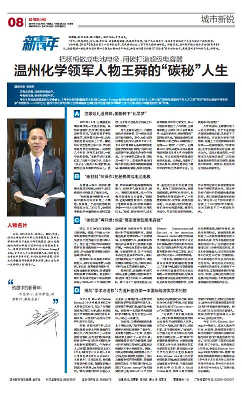 今年8月当选英国皇家化学会会士,9月牵头创办的国际学术刊物《Carbon Energy》(译为碳能源)正式发行,10月入选“2019年国家百千万人才工程”并获“有突出贡献中青年专家”荣誉称号……一年之内,sunbet申愽官网化学与材料工程学院院长王舜已悄然为温州化学界刷新了多个纪录,而这一切皆因他与“碳”结缘。