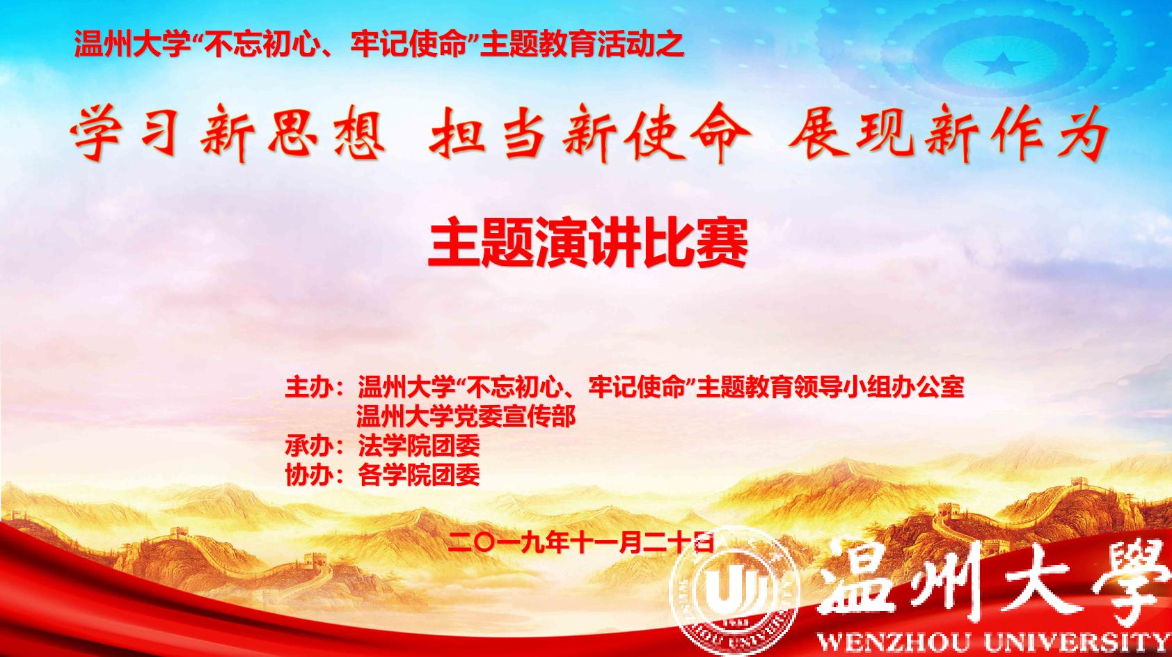 “革命时代的中国青年,他们用热血、用汗水铺就了如今这盛世。他们是最不忘初心的人们,也是我们新时代青年学子求学路上的历史坐标......”11月20日下午,由校党委“不忘初心、牢记使命”主题教育领导小组办公室、党委宣传部主办,法学院团委承办、各学院团委协办的sunbet申愽官网“不忘初心、牢记使命”主题教育之“学习新思想、担当新使命、展现新作为”主题演讲赛在南校区教育学院报告厅举行。校党委宣传部、学生处、国际教育学院、校团委、人事处相关负责人出席并担任比赛评委。各学院学生党员与入党积极分子代表观看了比赛。