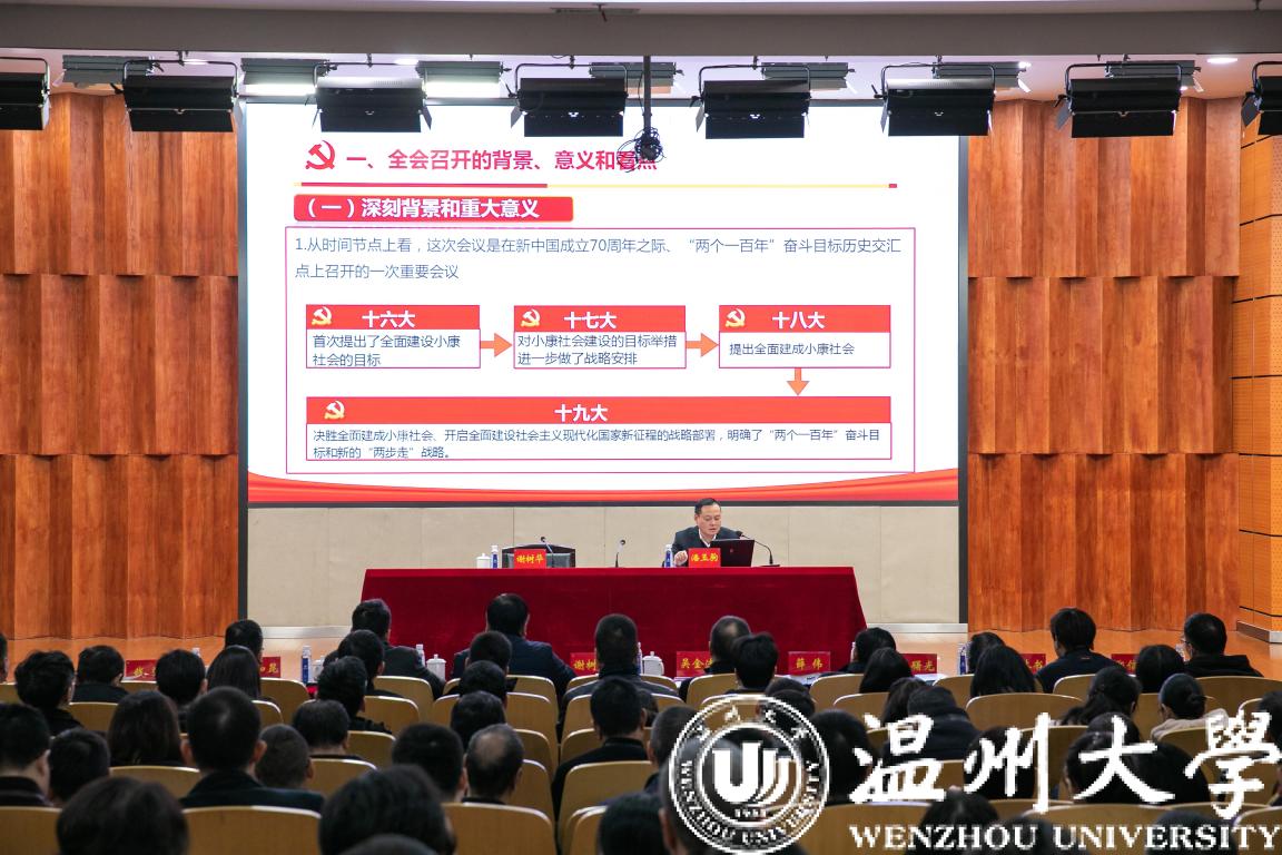 专题学习会上,校党委委员、宣传部部长潘玉驹同志作十九届四中全会精神解读专题报告。他围绕党的十九届四中全会精神,对我国国家制度和国家治理体系十三个方面的显著优势进行系统宣讲,对坚持和完善中国特色社会主义制度,推进国家治理体系和治理能力现代化的指导思想、总体要求、总体目标和重点任务,开启“中国之治”的新境界等方面做了全面深入的解读。