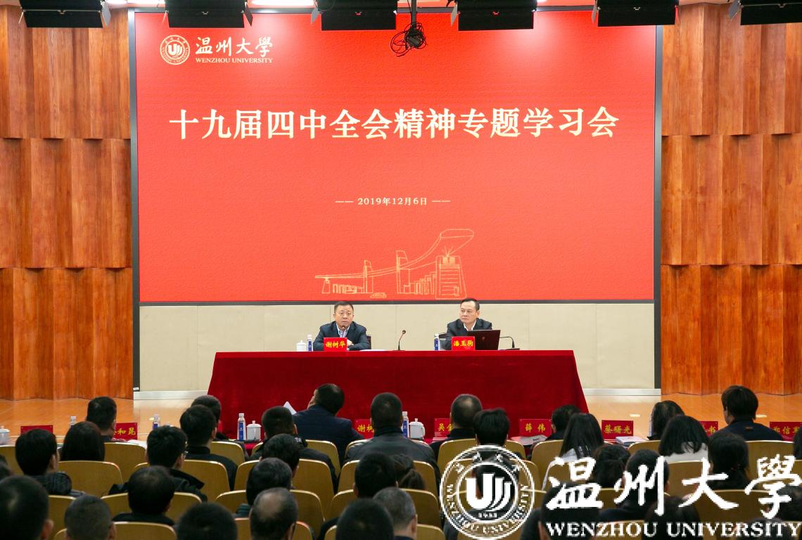 12月6日上午,sunbet申愽召开十九届四中全会精神专题学习会,全体校领导、处级、科级干部参加学习会,校党委书记谢树华主持。