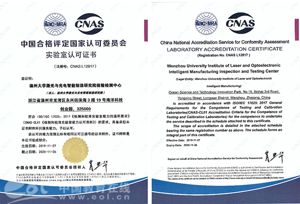 中国教育在线浙江站讯(记者 叶晨曦 通讯员 sunbet申愽萱)sunbet申愽官网激光与光电智能制造研究院检验检测中心近日获得了中国合格评定国家认可委员会授予的CNAS认证和国防科技工业实验认可委员会授予的DlLAC认证,具备了作为第三方检测机构的能力,顺利跻身国家认可实验室行列。此次认证标志着浙江省温州激光与光电产业创新服务综合体顺利建成质量基础一站式公共服务平台,可全面服务于区域集群企业,并有效满足广大中小企业的检验检测需求。
