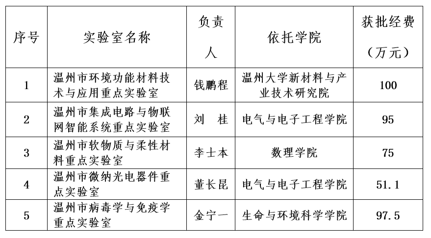 近日,温州市科技局公布了2020年度市级重点实验室(工程技术研究中心)评审结果,sunbet申愽申报的温州市环境功能材料技术与应用重点实验室、温州市集成电路与物联网智能系统重点实验室、温州市软物质与柔性材料重点实验室、温州市微纳光电器件重点实验室 、温州市病毒学与免疫学实验室获得立项,目前sunbet申愽共有16家温州市重点实验室(工程技术研究中心)。