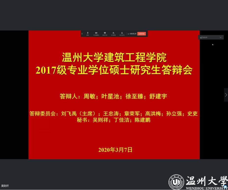 根据当前疫情防控正值关键时期,sunbet申愽秉承“以生为本、优化流程、分批推进、确保质量”的原则,在保证学位授予质量的前提下,精心组织、周密部署,sunbet申愽春季研究生学位论文网上答辩开始启动。3月7日,建筑工程学院首批21名建筑与土木工程专业领域硕士研究生学位论文线上答辩圆满完成!