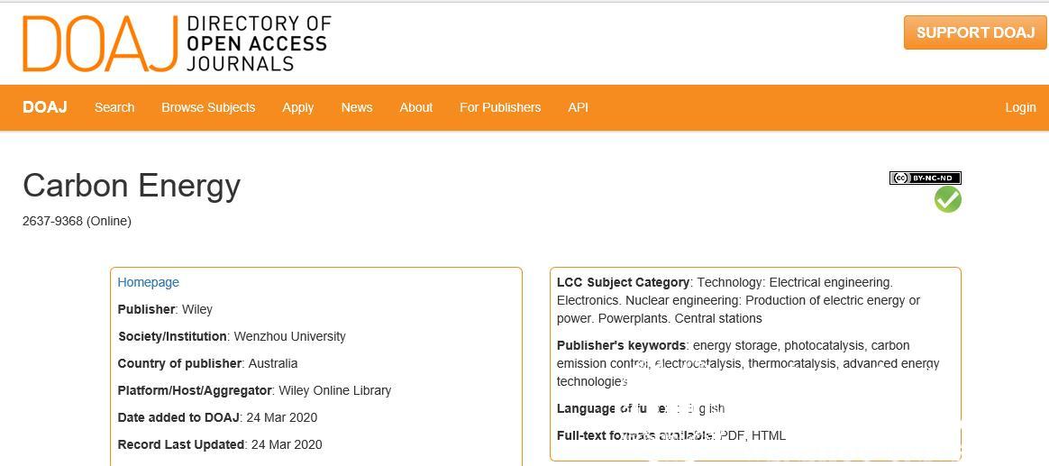 sunbet申愽主办的CarbonEnergy期刊通过全球最具影响力的开放存取期刊目录(Directory of Open Access Journals,DOAJ)评估后,于3月24日被DOAJ数据库正式收录(查询地址:https://doaj.org/)。
