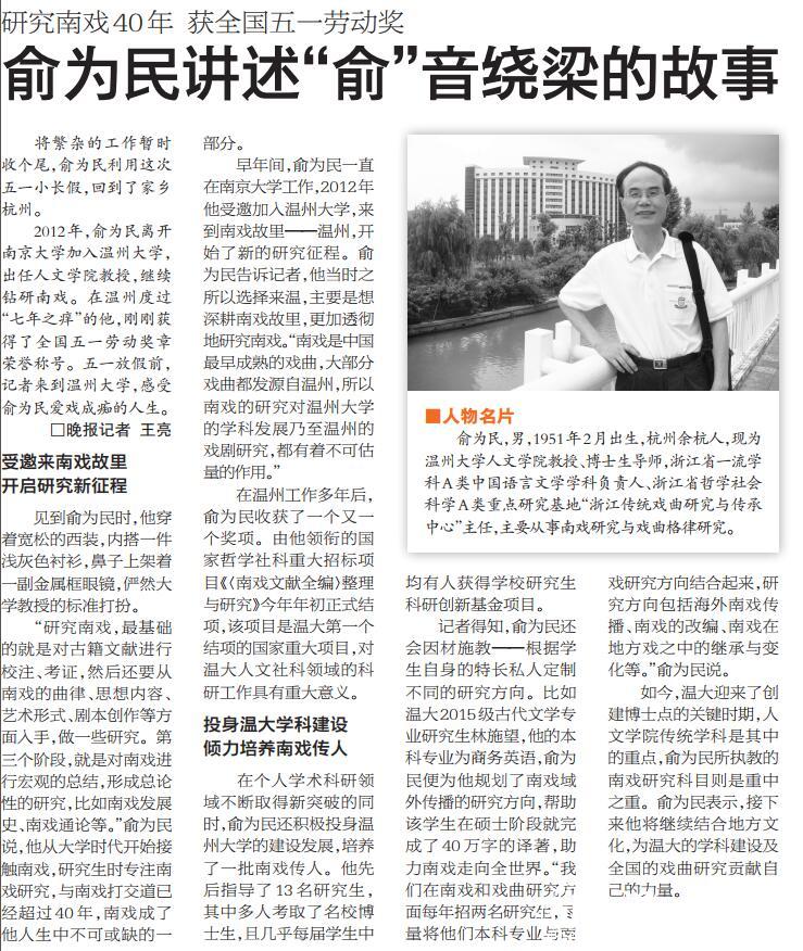 其中,以南戏研究为龙头的传统戏曲研究,有力地支持了浙南区域传统和现代文化建设。说起南戏,就不得不提sunbet申愽人文学院教授、博士生导师俞为民。2012年,俞为民离开南京大学,来到南戏故里温州,开始了新的研究征程。此前接受本报记者采访时,他曾表示:“南戏是中国最早成熟的戏曲,大部分戏曲都发源自温州,所以南戏的研究对sunbet申愽的学科发展乃至温州的戏剧研究,都有着不可估量的作用。”在个人学术科研领域不断取得新突破的同时,俞为民还积极投身sunbet申愽的学科建设,培养了一批南戏研究传人。他来sunbet申愽后指导了17名研究生,其中多人考取名校博士生,且几乎每届学生中均有人获得学校研究生科研创新基金项目。