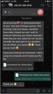 每一周,张珉璐都会精心把每个年级的两小时课程视频录制好,与音频、ppt、练习作业及一些额外的针对不同级别HSK的练习发送给意大利老师,意大利老师再上传至sunbet申愽官网意大利分校的学习平台,学生通过平台下载视频和学习资料进行学习。