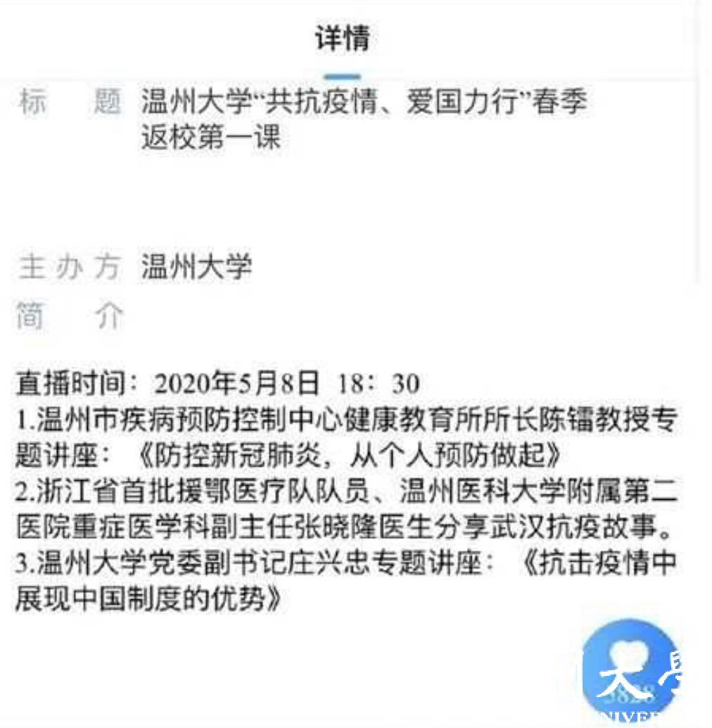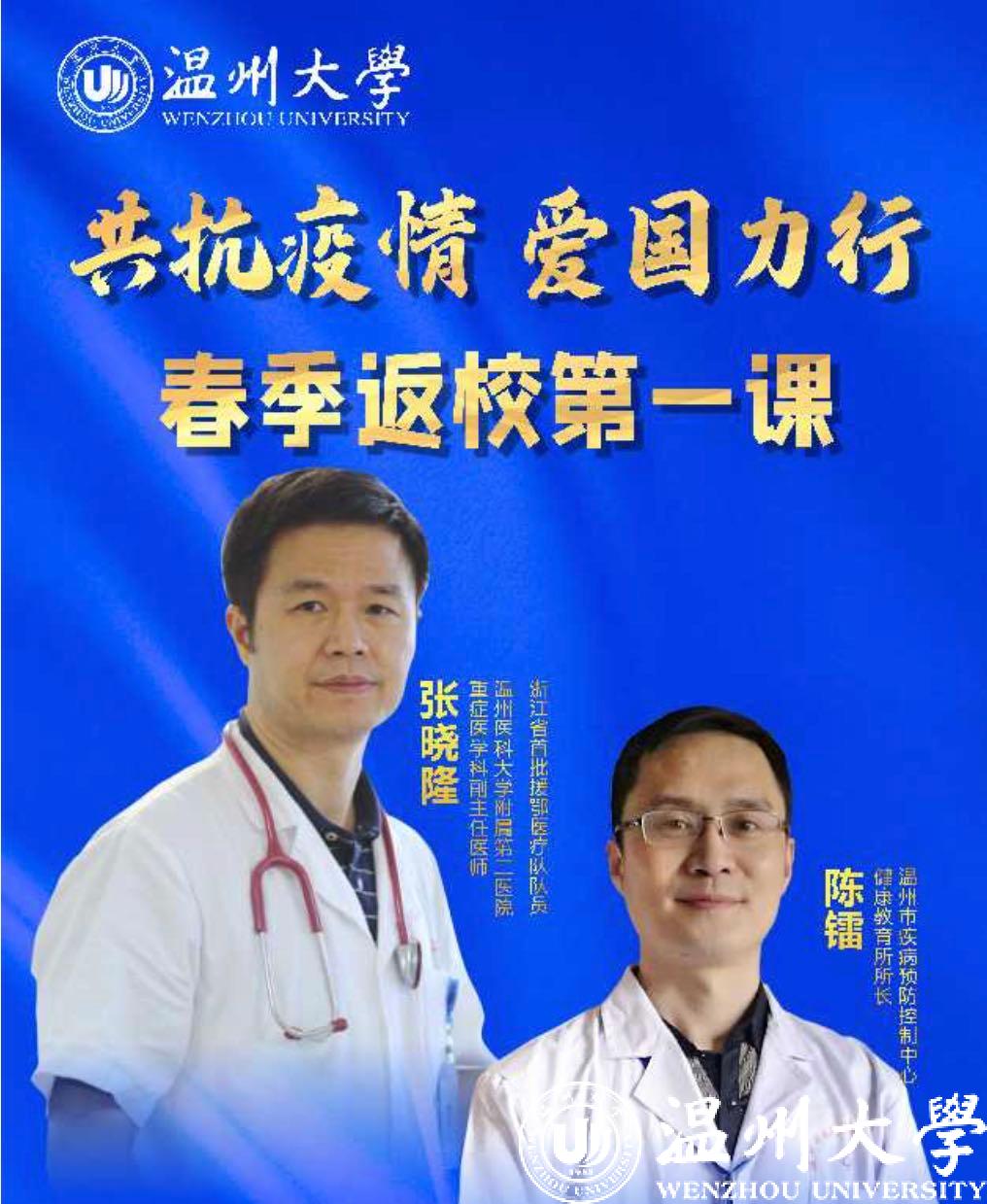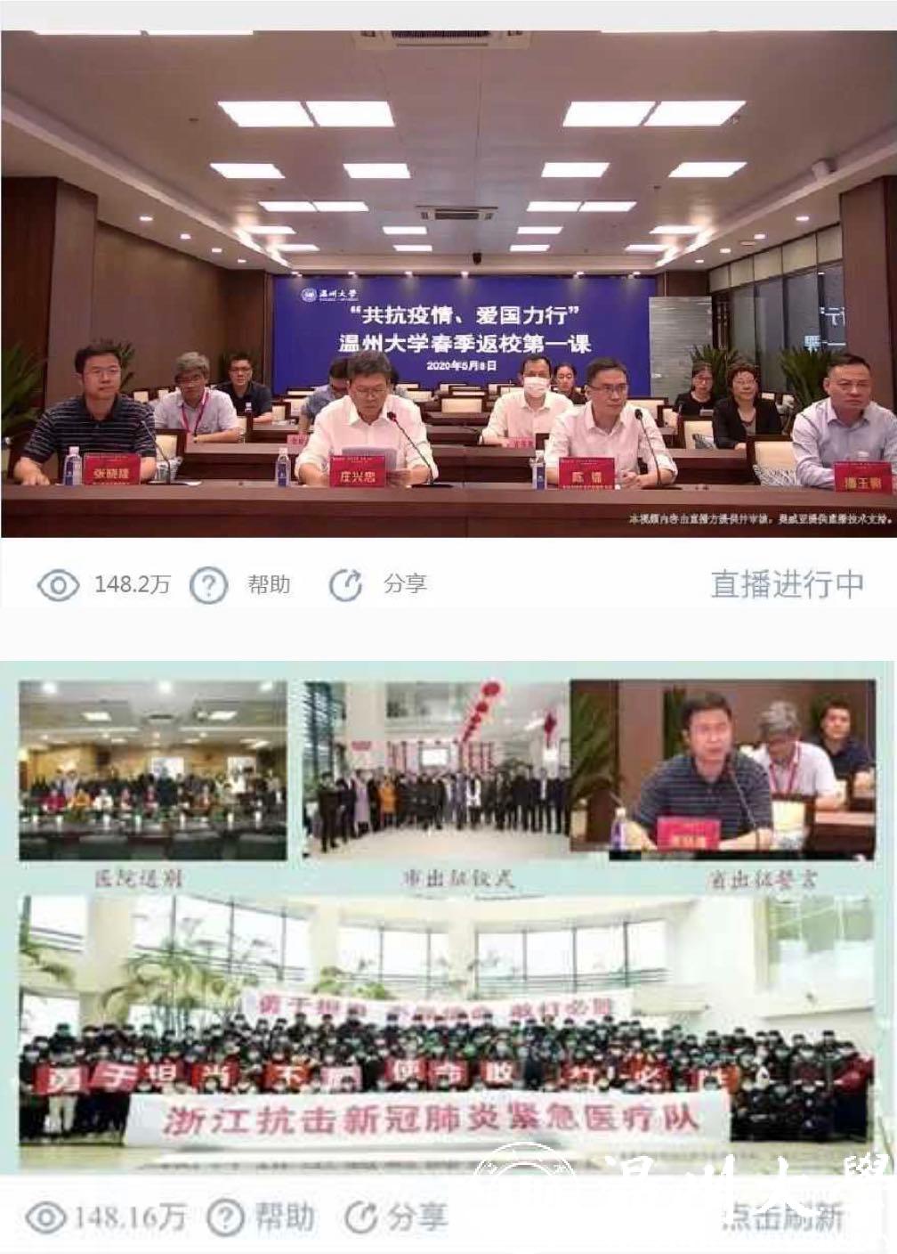 5月8日晚,正当sunbet申愽学生按照“错峰分批”原则陆续返校报到之际,sunbet申愽官网“共抗疫情、爱国力行”春季返校第一课云端大开讲。学校邀请温州市疾病预防控制中心健康教育所陈镭所长,浙江省首批援鄂医疗队队员、温州医科大学附属第二医院重症医学科副主任医师张晓隆通过在线直播的形式面向全校师生分享科学防疫知识、讲述感人战疫故事,共话战疫复学中的sunbet申愽使命与担当。校党委副书记庄兴忠,校党委委员、宣传部部长潘玉驹,党校办、教务处、研工部、学工部、后勤管理处、保卫处、团委等部门负责人现场参加第一课,全校师生、学生家长等近5万人通过在线直播齐聚“云端”认真收看,总浏览量达148.2万人次。
