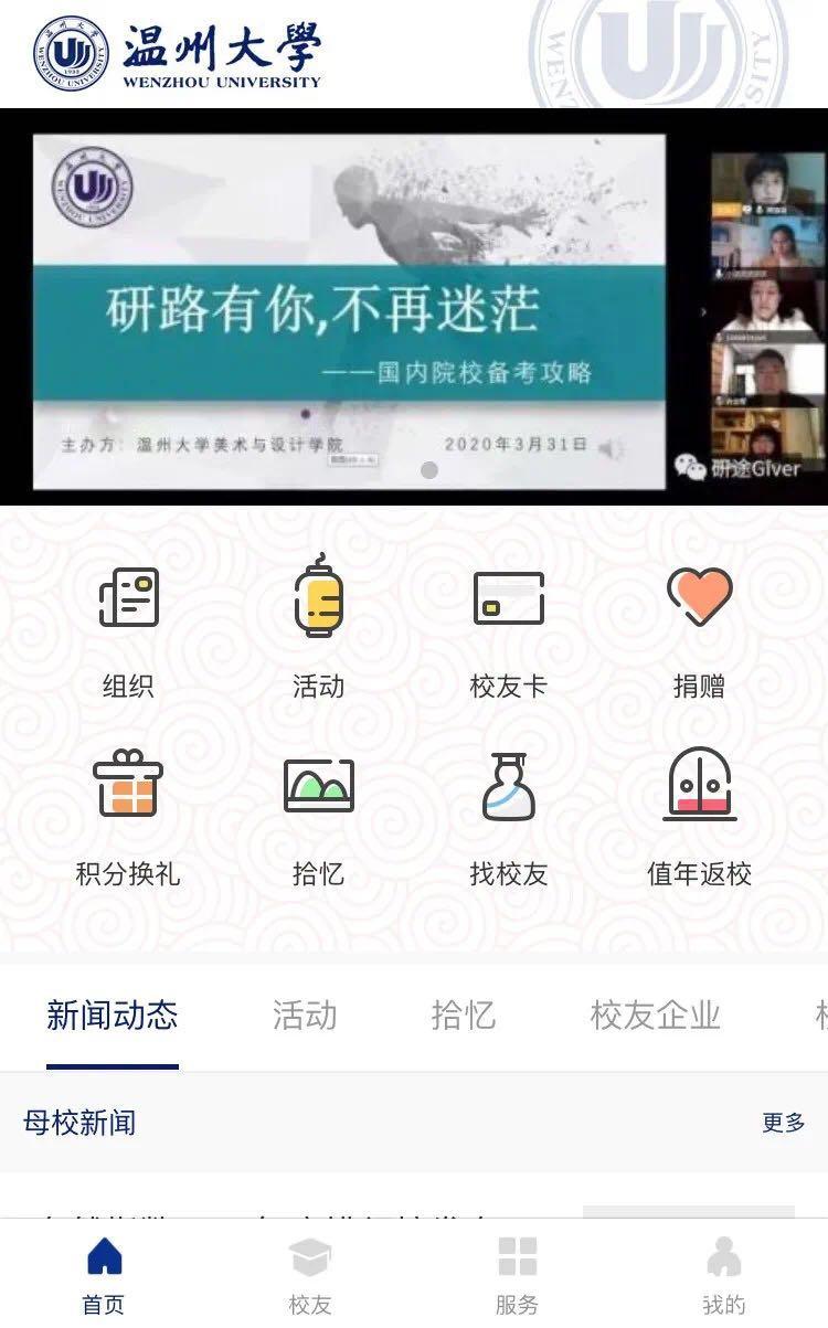 校友云分享。邀请各行业的校友线上分享自己的行业知识,创业、拼搏的精彩故事,与在校生、校友互动交流。