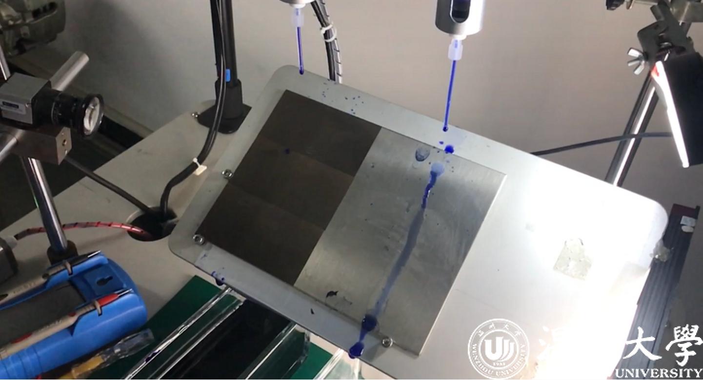 李峰平操作机器,在按下按钮后,两根塑料管几乎同时挤出一颗蓝色水珠,水珠分别掉落在两块金属表面上,呈现出了完全不同的两种形态——一颗水珠一路翻滚掉落,另一颗水珠变成了一摊水迹。