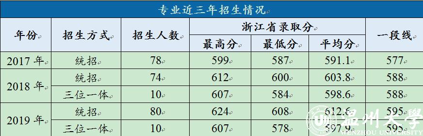 本专业一直深受家长和考生的欢迎。每年招生人数在80人左右,其中近三年省外招生人数在20人左右。省内生源的录取分数线高出浙江省一本线10分左右,第一志愿率为100%,位次号逐年递升;其它省份的一本线录取率几乎为100%,第一志愿报考率逐年升高。自2018年起,本专业新增“三位一体”招生制度,2018年和2019年招生人数均在10人左右,2020年计划扩招到本年度招生总量的30%。