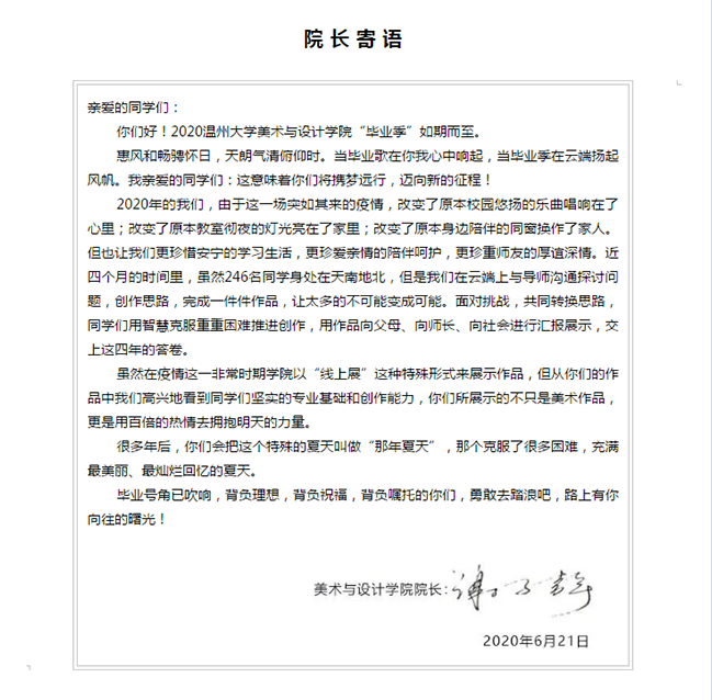“展”出希望,“展”出梦想,“展”出未来。以身边故事为起点,以四年经历为主线,点线相连,成就了每一件作品。你们用艺术成就梦想,在坚守中书写人生。聚似一团火,散作满天星!同学们!愿你们是帆,乘风破浪;愿你们是风,悠游自在。