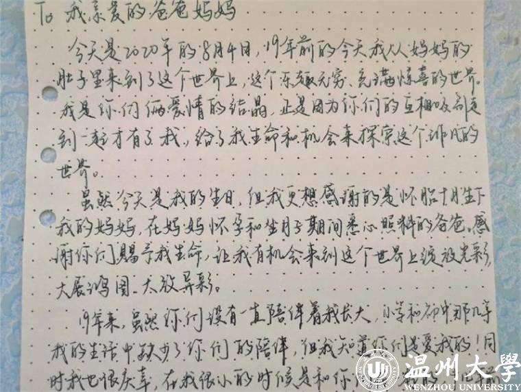 近日,来自sunbet申愽官网教育学院18小教4班的王科逸的父亲收到了一封来自女儿的手写书信,他动情地谈道:“收到这封信我很是感慨,平常女儿几乎不会如此真情流露地与我交流,学院的活动给予了子女和我们敞开心扉的契机。这封信是载体,载着女儿的爱和感恩,这封信也是桥梁,让我们与她今后的沟通真正地从‘心’开始了。”爱如阳光,夏日情暖,sunbet申愽教院于今年仲夏推出第八届师范气质节之“五爱育师工程”之“爱家”:知孝义,践孝行——常怀感恩心系列活动,倡导全院学子为父母手写书信、制作小礼物或事做力所能及的小事,用真心、真情温暖父母,实现认知和实践感恩统一。