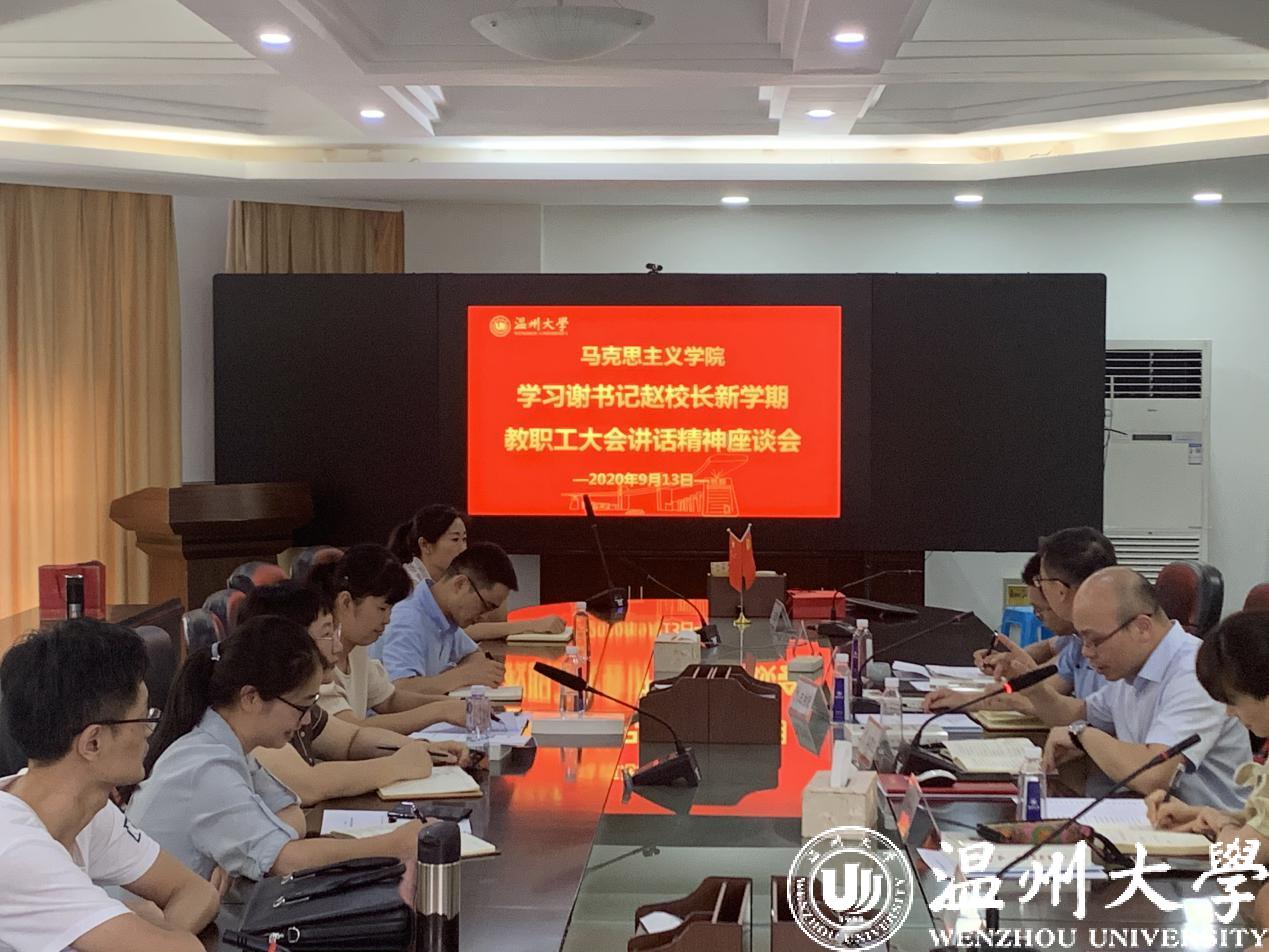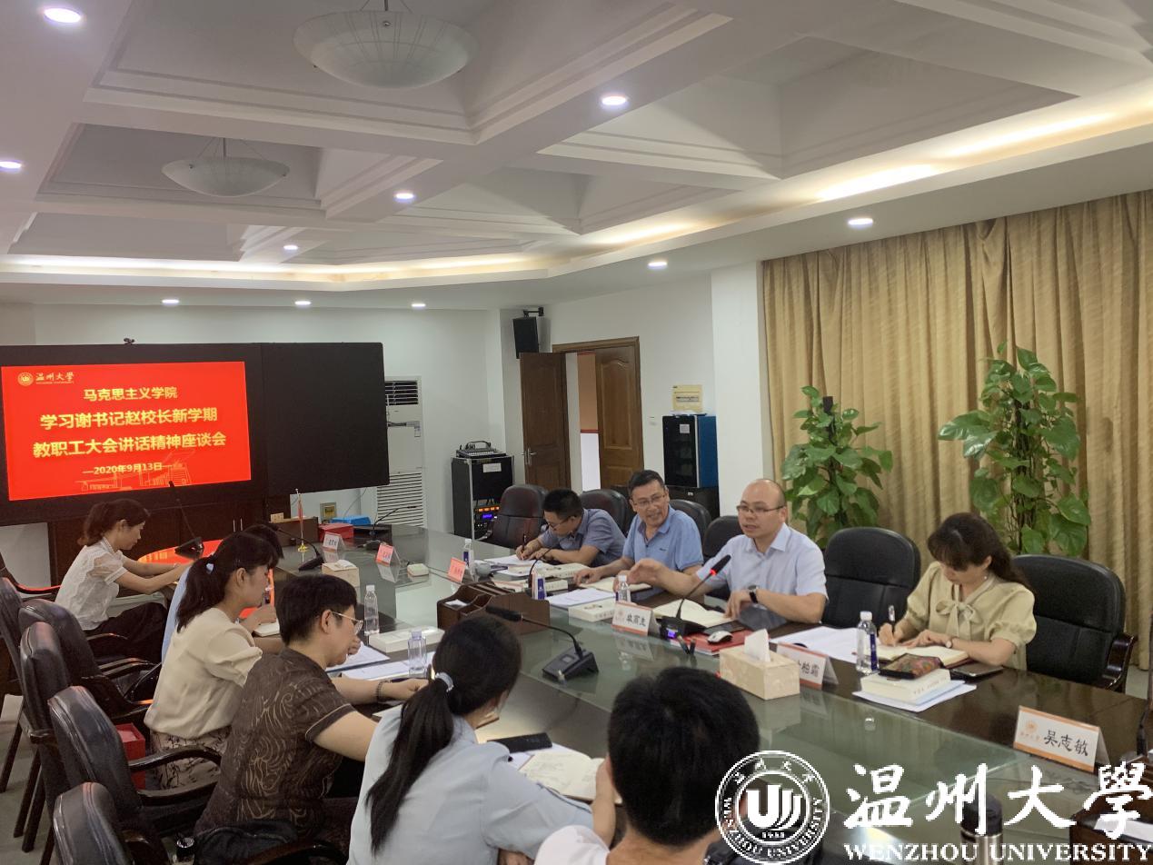 马克思主义学院教师掀起学习教职工大会精神热潮,于13日下午召开了“学习谢书记赵校长新学期教职工大会讲话精神座谈会”,专任教师、党支部书记、班主任、辅导员纷纷畅谈自己的学习体会。