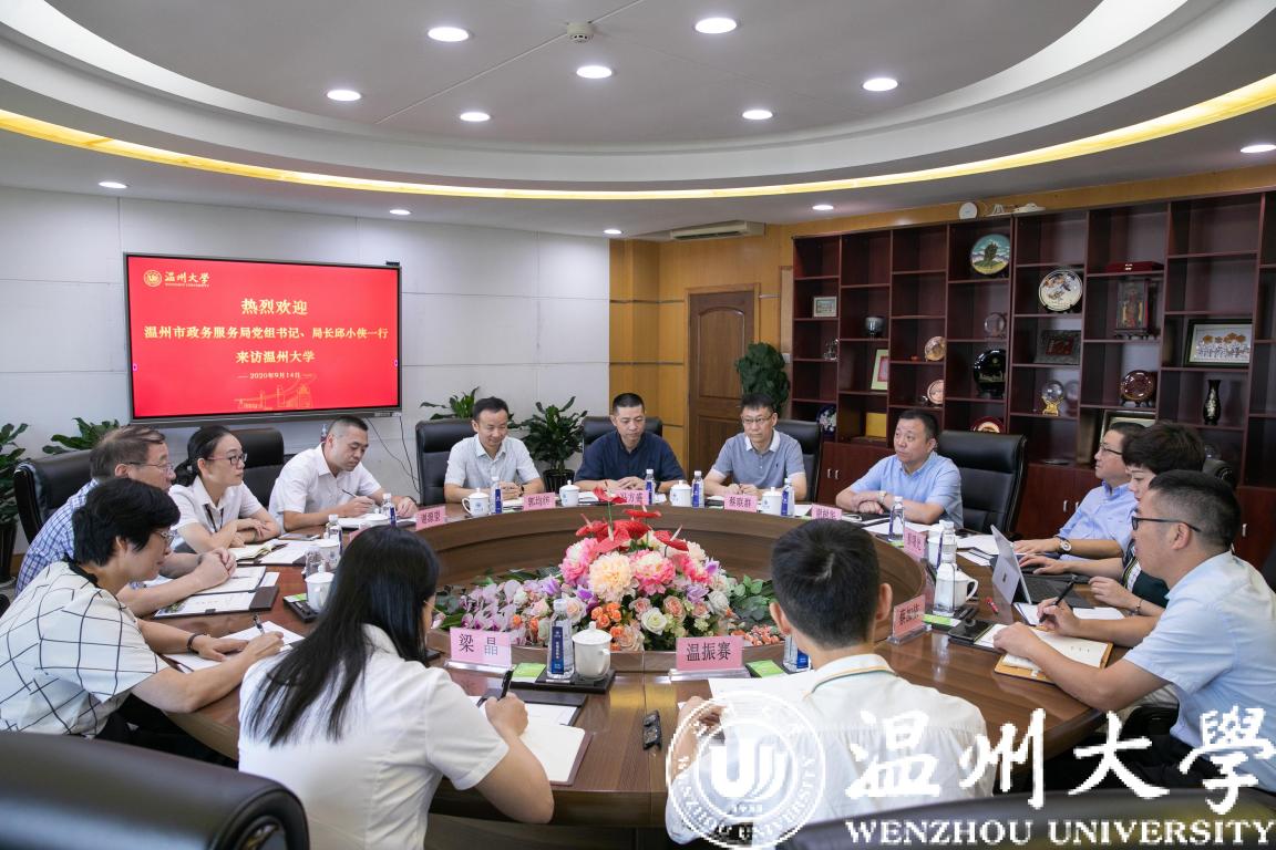 9月17日,温州市政务服务局党组书记、局长邱小侠,副局长詹尔成等一行来访sunbet申愽官网。校党委书记谢树华,副校长蔡曙光出席接待,相关部门负责人参加座谈。