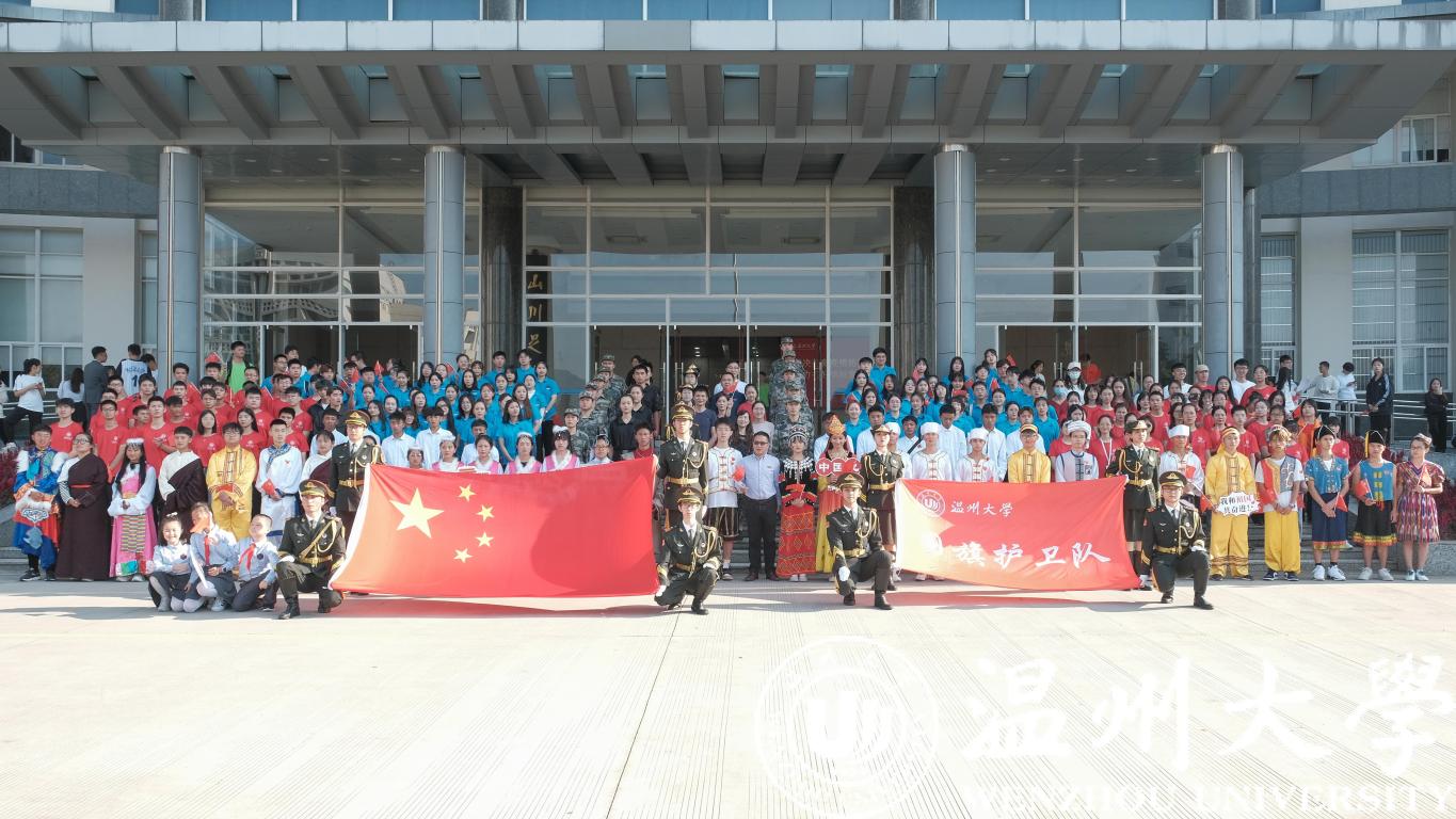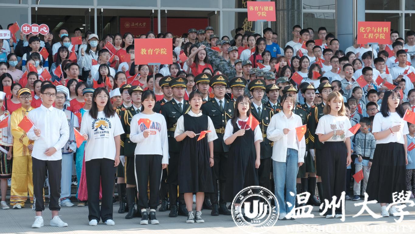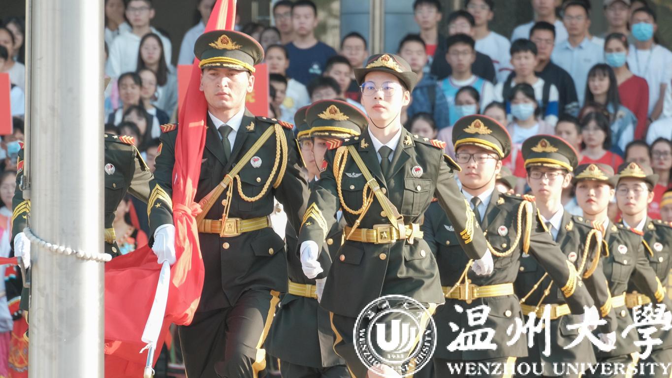 上午7点半,在铿锵有力、整齐划一的脚步声中,国旗护卫队来到升旗台前护卫国旗。当《义勇军进行曲》响起时,五星红旗冉冉升起。在场所有师生代表庄严站立,面向五星红旗高唱国歌,激情澎湃。值得一提的是,来自24个少数民族的学生身着民族盛装,共同迎接这一圣神的时刻。