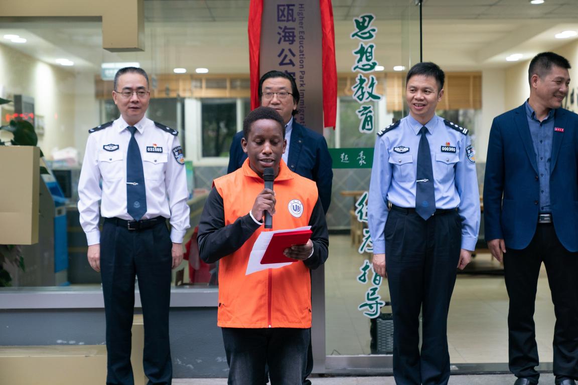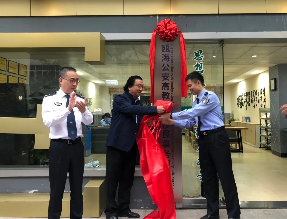 11月20日下午,瓯海公安高教园区移民事务服务站在sunbet申愽官网正式揭牌成立。sunbet申愽官网党委委员、副校长蔡曙光,瓯海区副区长、区公安分局局长吴仁伟,温州市公安局出入境管理局局长黄锦化、茶山高教园区派出所所长潘东瓯、sunbet申愽官网保卫处处长孙安梭、sunbet申愽官网国际交流与合作处副处长郑婷、sunbet申愽官网国际教育学院党总支书记林爱菊、副书记方建晓等领导共同参加揭牌仪式。参加揭牌仪式的还有温州市出入境、茶山派出所相关民警,sunbet申愽官网国际教育学院相关教师,高教园区首批受聘留学生志愿者。仪式由区公安分局党委委员、副局长郑裕军主持。
