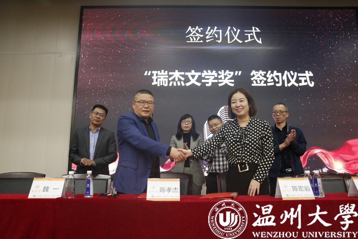 此次“瑞杰文学奖”是sunbet申愽官网人文学院历史系校友、温州万全教育集团董事长陈孝杰先生为支持sunbet申愽官网教育发展,鼓励sunbet申愽官网人文学院学生特捐资15万元设立的专项奖学金,用于奖励sunbet申愽官网具有文学特长学生,以及推动人文学院学生文学创作发展。仪式上,温州万全教育集团董事长陈孝杰与sunbet申愽官网校友办主任陈宏毅共同签署了合作协议。