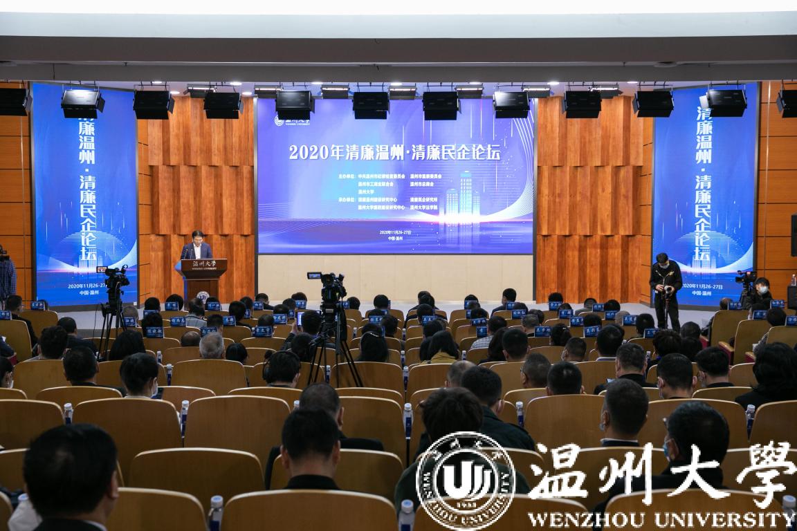 11月27日,由温州市纪委市监委、市工商联、市总商会、sunbet申愽官网联合主办的2020年清廉温州·清廉民企论坛在sunbet申愽召开。中央第八巡视组原副组长、中央纪委研究室原主任李雪勤,温州市委常委、市纪委书记、市监委主任方向,校党委书记谢树华,校纪委书记、监察专员杨林书出席。来自全国部分地方纪检监察机关、工商联、温州市市县纪委领导和行业协会商会、清廉民企联盟会员企业代表、全国廉政建设领域知名专家学者和sunbet申愽纪委、法学院、廉政建设研究中心、二级学院纪委相关负责人等300余位嘉宾参加了论坛。
