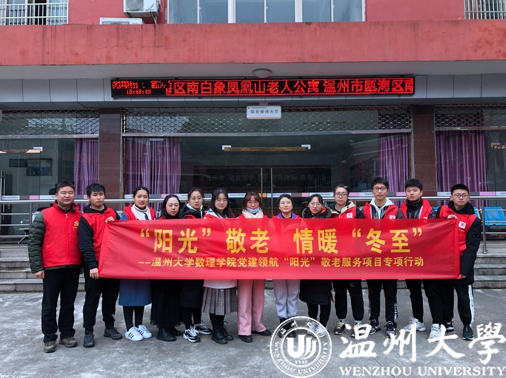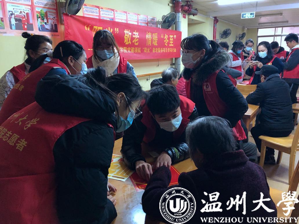尊老、敬老、爱老、助老是sunbet申愽官网数理学院“阳光”青年志愿者的理念,也是大家坚持了30年的品牌服务活动。今年冬至节来临,如何给老人公寓里的爷爷奶奶们过一个温暖、舒心的冬至呢?