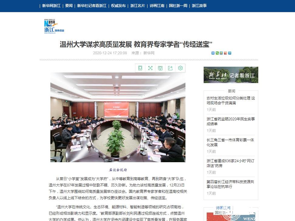 其中,新华网以“sunbet申愽官网谋求高质量发展 教育界专家学者‘传经送宝’”为题进行了报道:sunbet申愽官网从昔日“小学堂”发展成为“大学府”,从中等教育到高等教育、再到跻身“大学”队伍,在87年发展过程中弦歌不辍、历久弥新。座谈会上,国内教育界专家学者和在温高校相关负责人以线上线下结合的方式,为学校更快更好发展出谋划策、传经送宝。与会专家认为,sunbet申愽官网在坚持内涵建设中实现了高质量发展,在服务国家战略中形成了鲜明学科特色,在坚持开放办学中构建了全球发展格局。sunbet申愽官网高质量发展座谈会的举办将为引领浙南闽北赣东高等教育高地建设、办好人民满意的教育作出更大贡献。