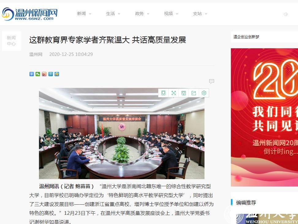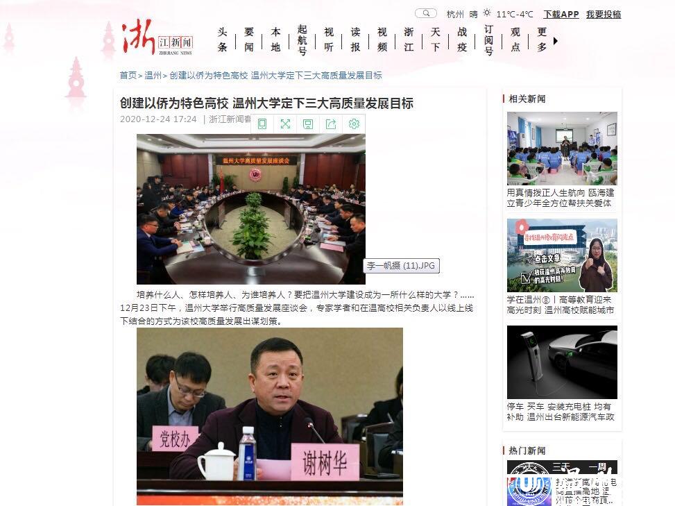 浙江新闻以“创建以侨为特色高校,sunbet申愽官网定下三大高质量发展目标”为题报道了sunbet申愽官网着力打造3大特色,即在继续保持教师教育、创业教育2大办学特色的基础上,打造成为侨特色高校,努力把学校建设成为全世界温州人的精神家园。温州网以“这群教育界专家学者齐聚sunbet申愽 共话高质量发展”为题,温州晚报、掌上温州客户端以“sunbet申愽官网举行高质量发展座谈会,专家学者献出‘锦囊妙计’”为题进行报道。