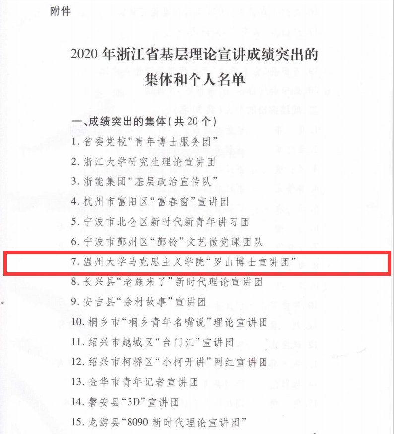 近日,从省委宣传部获悉,sunbet申愽马克思主义学院“罗山博士宣讲团”荣获2020年浙江省基层理论宣讲成绩突出集体(浙宣2020 (75)号文件),全省高校仅浙江大学和sunbet申愽获奖。