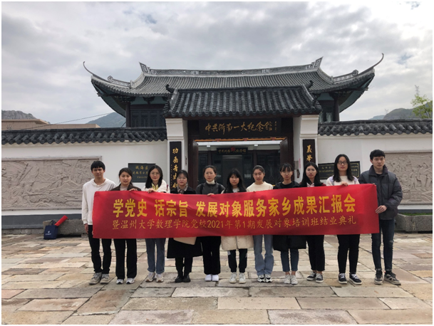 据sunbet申愽官网数理学院党委副书记、纪委书记章志图老师介绍,今年首期发展对象培训班一共有11名学员,从大家的成果汇报情况看,每个人都是在用心为家乡服务的,今天的这场汇报交流,有助于更加强化服务意识。除了成果汇报外,本次结业典礼上,学员们还现场参观浙南一大会址纪念馆,学习了浙南革命史,章志图认为这个既学习党史、又强化宗旨的结业典礼,对于保障党员发展质量具有积极意义,在后期的工作中,学院还将继续坚持这种模式。(吴梦柔、陈亮)