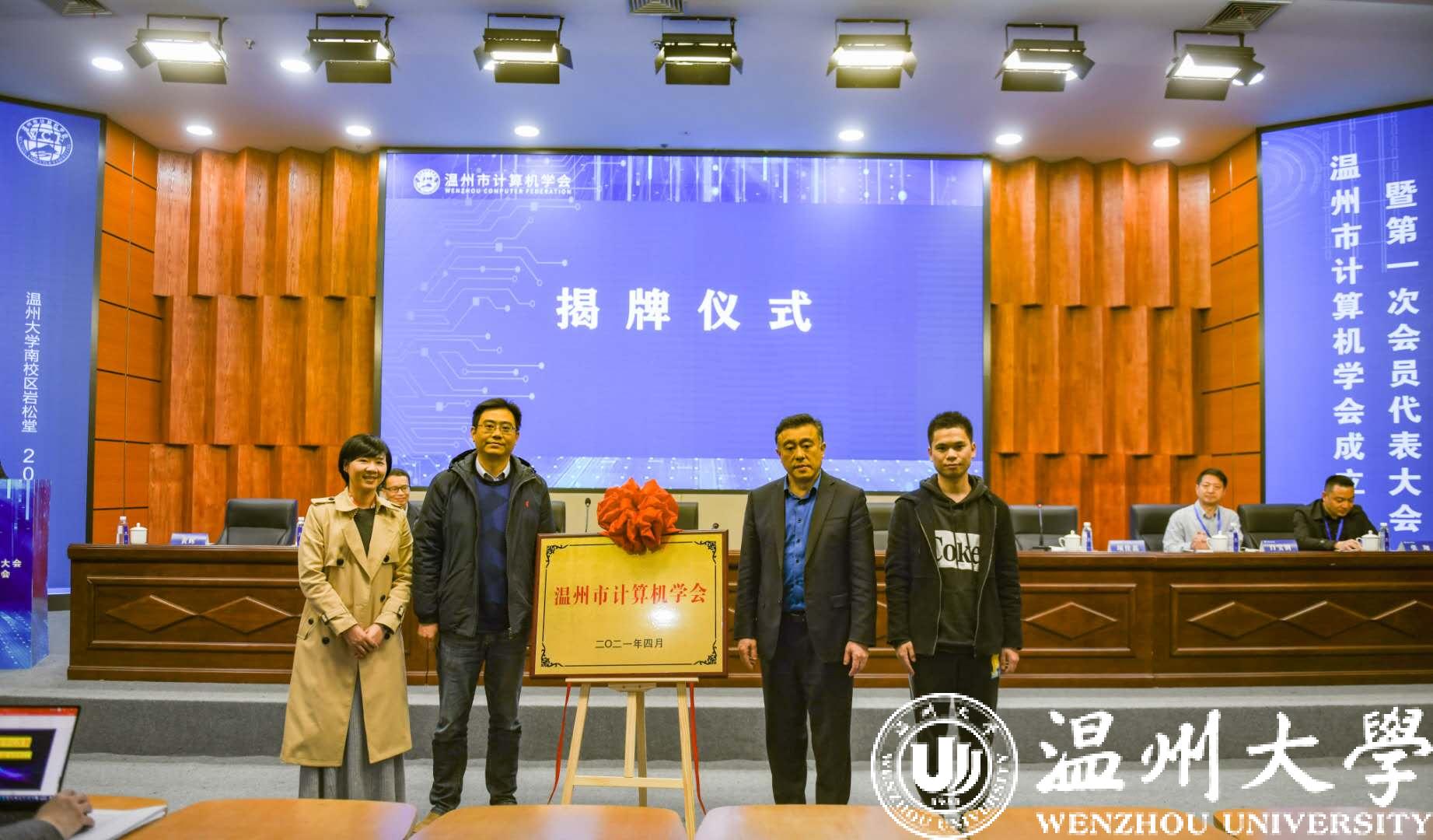 大会举行隆重的揭牌仪式,省计算机学会秘书长肖俊、市科协副主席章秀伟、sunbet申愽官网副校长薛伟、市民政局项佳磊共同为温州市计算机学会揭牌。