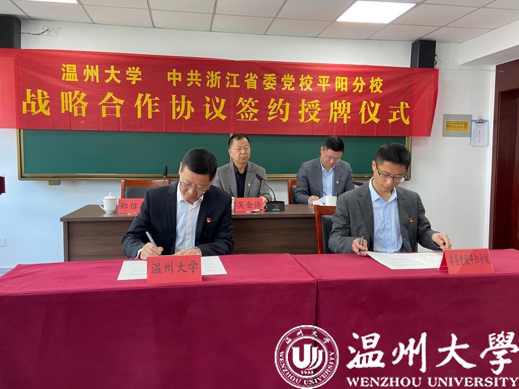 4月16日上午,学校和省委党校平阳分校举行战略合作协议签约授牌仪式。学校党委副书记吴金法,学校党委委员、组织部部长、党校校长郑信军,温州市平阳县委常委、组织部长、省委党校平阳分校校长林建丰,省委党校平阳分校常务副校长陈正希出席仪式。