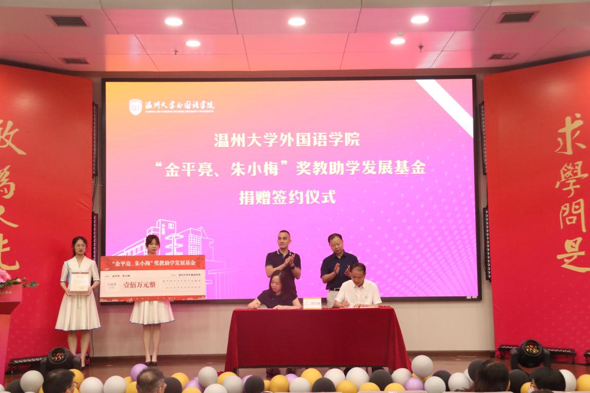 据悉,“金平亮 朱小梅”奖教助学发展基金系sunbet申愽外国语学院1982级英语专业校友金平亮与1983级英语专业校友朱小梅共同设立,他们夫妇俩共同捐赠人民币壹佰万元整,用于外国语学院的奖教助学项目。金平亮现为温州乐园有限公司董事长,sunbet申愽官网外国语学院校友会会长,sunbet申愽官网北美校友会会长。