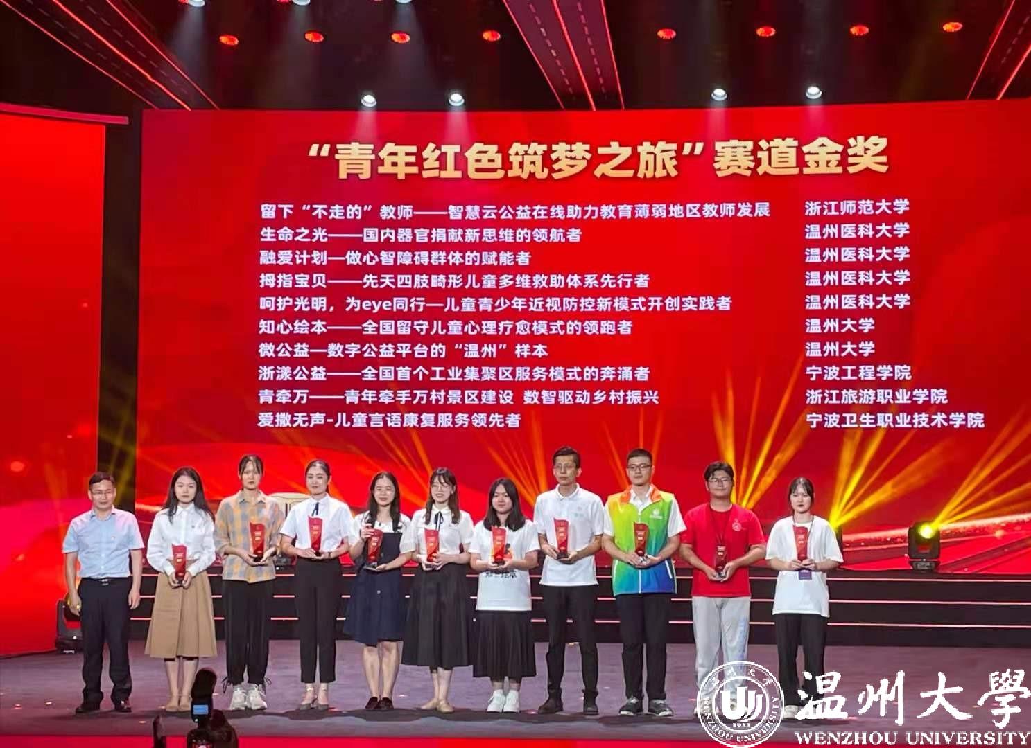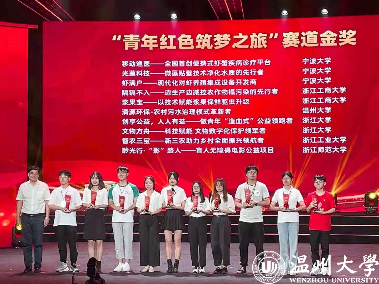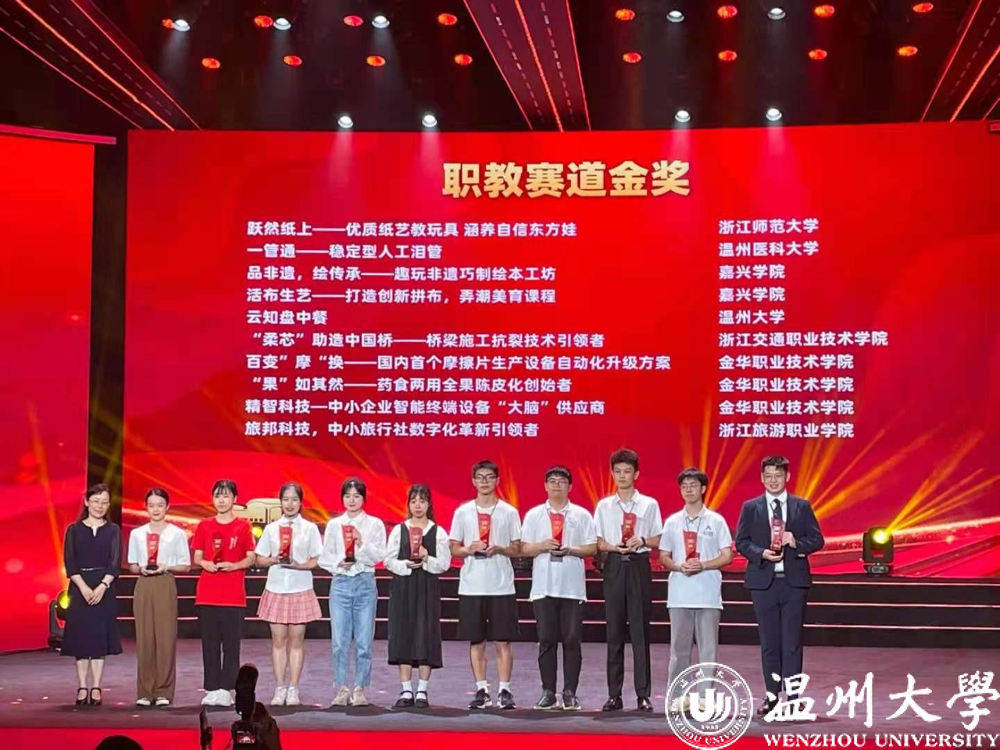 5项金奖中,《云知盘中餐》项目获得职教赛道金奖,《清源环保-农村污水治理模式革新者》《知心绘本——全国留守儿童心理疗愈模式的领跑者》《微公益—数字公益平台的“温州”样本》3个项目获得“青年红色筑梦之旅”赛道金奖,《Wento technology:Fully degradable new solution provider》项目获得国际赛道金奖。