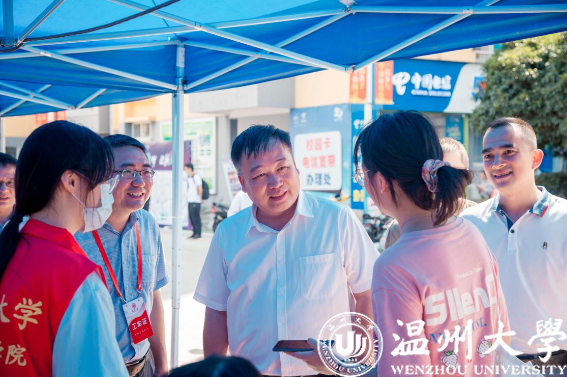 上午,校领导来到各学院新生报到点检查新生接待工作,了解报到流程、疫情防控等工作,亲切看望来校报到的新生和家长,并对辛勤工作在一线的师生员工进行慰问。