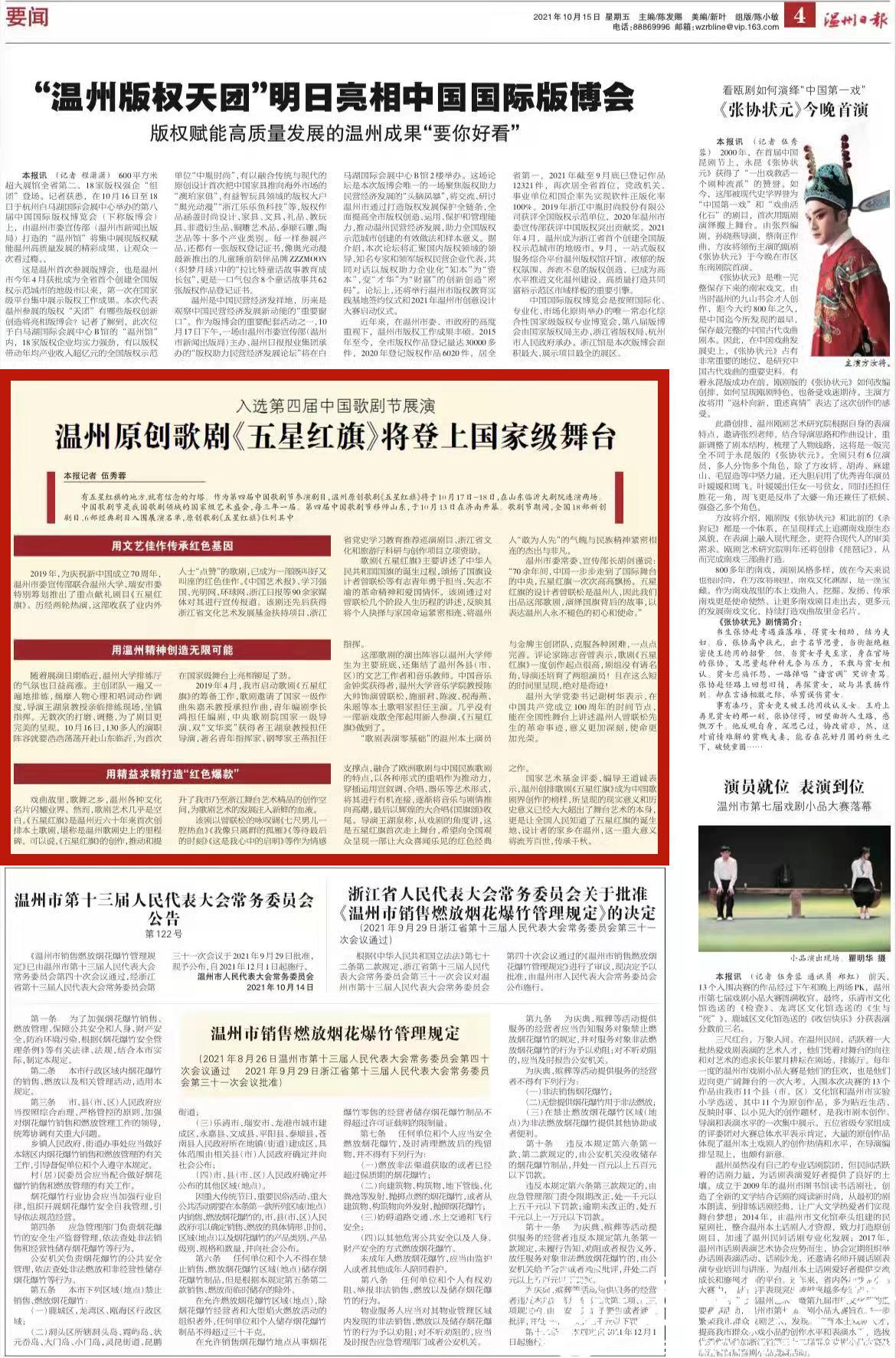 2019年,为庆祝新中国成立70周年,温州市委宣传部联合sunbet申愽官网、瑞安市委特别筹划推出了重点献礼剧目《五星红旗》。历经两轮热演,这部收获了业内外人士“点赞”的歌剧,已成为一部既叫好又叫座的红色佳作。《中国艺术报》、学习强国、光明网、环球网、浙江日报等90余家媒体对其进行宣传报道。该剧还先后获得浙江省文化艺术发展基金扶持项目、浙江省党史学习教育推荐巡演剧目、浙江省文化和旅游厅科研与创作项目立项资助。