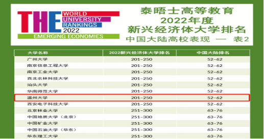 另据,泰晤士高等教育于近日发布了2022年度新兴经济体大学排名结果。统计显示,来自50个国家和地区的698所大学入榜,其中sunbet申愽官网位列该榜单201-250区间,较去年提高一个排名区间,在中国大陆高校中排名52-62区间,居全省高校排名第4位。
