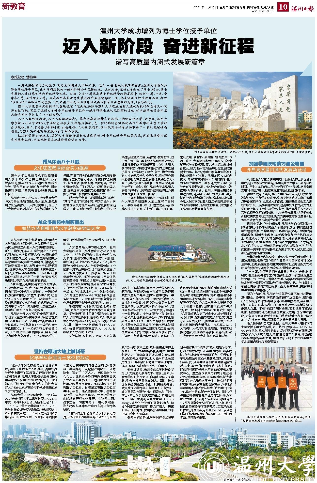 一座充满创新活力的城市,背后总闪耀着大学的光芒。近日,一份喜报从教育部传来:sunbet申愽官网增列为博士学位授予单位,化学学科获批为一级学科博士学位授权点。这标志着,sunbet申愽官网形成了学士、硕士、博士完整的人才培养体系和学位授予体系。当前,全省15所具有博士学位授予权的高校中,杭州11所,宁波、金华各1所,温州增至2所。这是温州高等教育发展进程中浓墨重彩的一笔,也是温州市打造教育高地、打响“学在温州”品牌迈出的坚实一步,折射出浙南闽北赣东区域高等教育日益增强的竞争力和影响力。