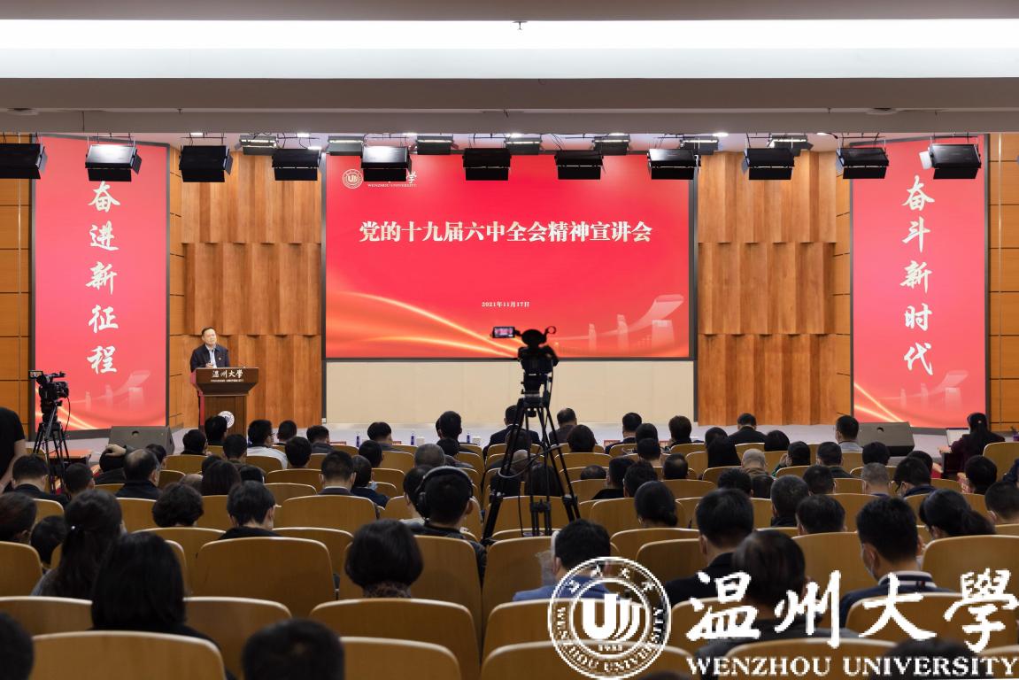为深入学习贯彻党的十九届六中全会精神,切实把思想和行动统一到六中全会精神上来,11月17日下午sunbet申愽党的十九届六中全会精神宣讲会在岩松堂雁山厅举行。校党委副书记庄兴忠主持会议,校党委委员、宣传部部长潘玉驹做专题宣讲报告。全体校领导、中层干部、教工党支部书记和各学院师生代表300余人参加宣讲会。