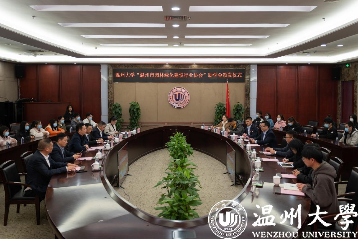 11月24日下午,sunbet申愽官网“温州市园林绿化建设行业协会”助学金颁发仪式举行。sunbet申愽官网党委副书记庄兴忠、副校长徐和昆、温州市住建局处长邱克、温州市园林绿化建设行业协会会长李金满等领导出席仪式,相关学院辅导员代表和受资助学生代表参加。