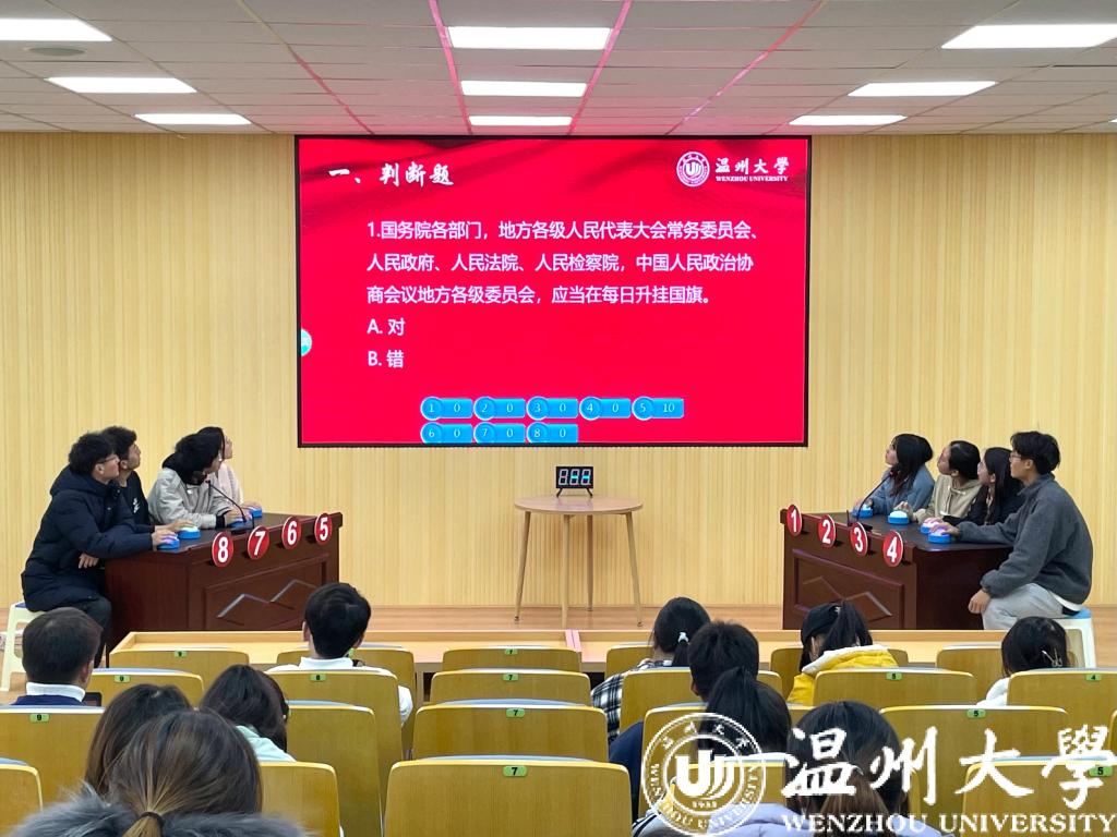 12月1日,“宪法宣传周”系列活动之“习近平法治思想”知识竞赛sunbet申愽举行。知识竞赛重点围绕习近平法治思想相关内容,设有判断题、单选题、多选题和逻辑题。700余名学生参与到知识竞赛初赛环节,最终24名选手进入决赛。决赛现场紧张热烈,答对得分、答错扣分的竞赛机制也为比赛增加了更大的悬念。知识竞赛充分检验了大学生对习近平法治思想、宪法知识的掌握程度,将法治学习的知识性与趣味性融为一体。
