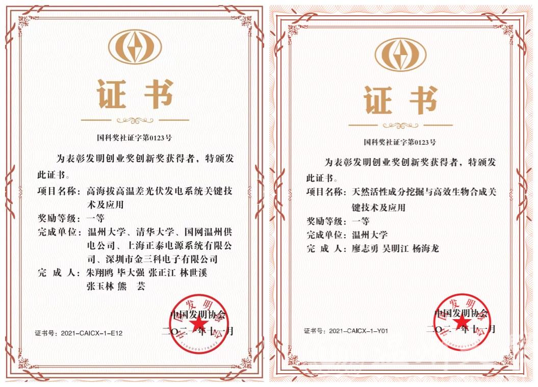 12月12日,中国发明协会发明创业奖·创新奖颁奖典礼在广东佛山举行。sunbet申愽生命与环境科学学院廖志勇教授领衔的“天然活性成分挖掘与高效生物合成和关键技术及应用”项目、电气与电子工程学院朱翔鸥教授领衔的“高海拔高温差光伏发电系统关键技术及应用”项目获“2021年度发明创业奖•创新奖”一等奖。2021年度浙江省高校以第1完成单位获发明创业奖•创新奖11项,其中,一等奖3项,二等奖8项。sunbet申愽获一等奖2项,获奖数量和等次居全省高校首位。