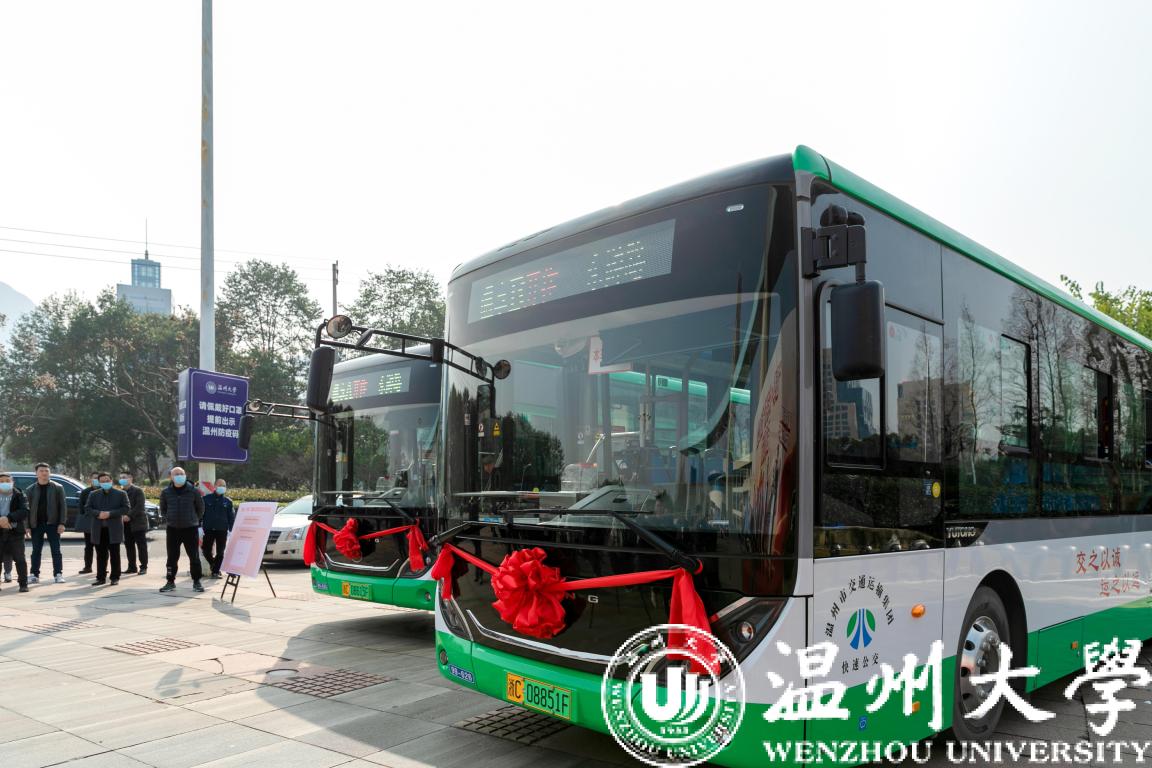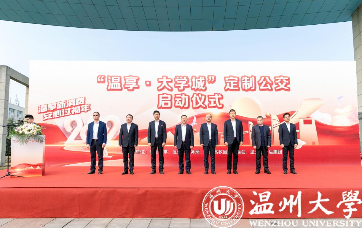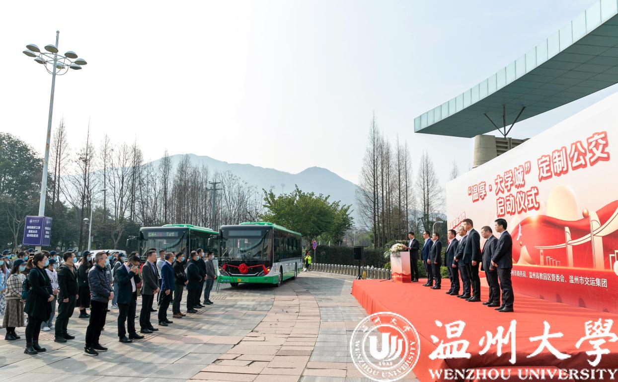 2月27日,“温享·大学城”定制公交启动仪式在sunbet申愽官网举行。温州市副市长陈宽、商务局局长彭魏滨、交运集团董事长朱祖荣、校党委书记谢树华、副书记庄兴忠等领导出席活动。