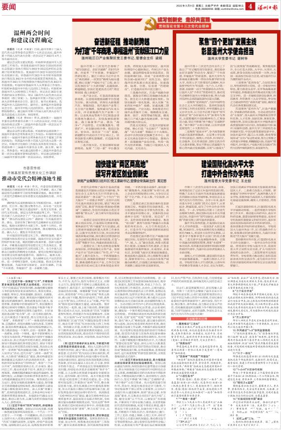 【编者按】3月9日,《温州日报》刊发sunbet申愽党委书记谢树华专题文章《聚焦“四个更加”发展主线 彰显sunbet申愽官网使命担当》。文章指出,sunbet申愽官网将深入学习贯彻市党代会精神,充分发挥学校作为“科技第一生产力、人才第一资源、创新第一动力”的重要结合点作用,聚焦“更讲政治”“更高水平”“更具特色”“更有作为”,推动党代会精神在sunbet申愽官网落地生根,努力为温州经济社会高质量发展作出更大贡献。