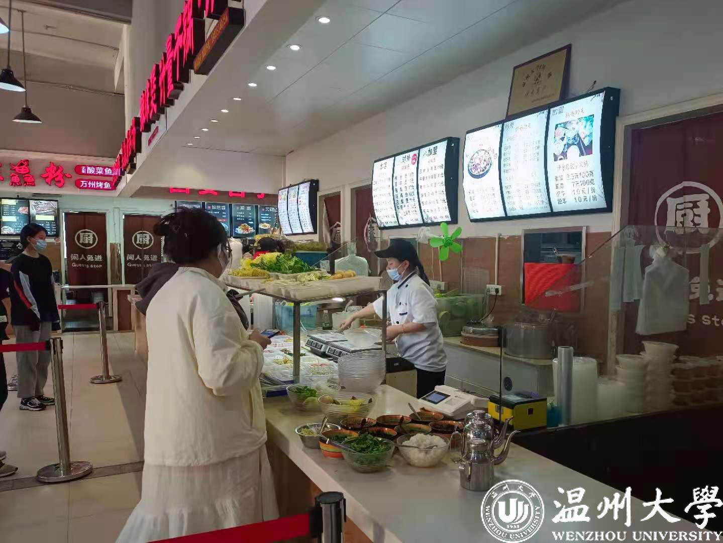 同学们出入食堂时自觉佩带口罩、检测体温。食堂设立单独就餐位,取餐处设一米排队等候线,同学们有序排队,规范用餐,尽量打包带走避免聚集。