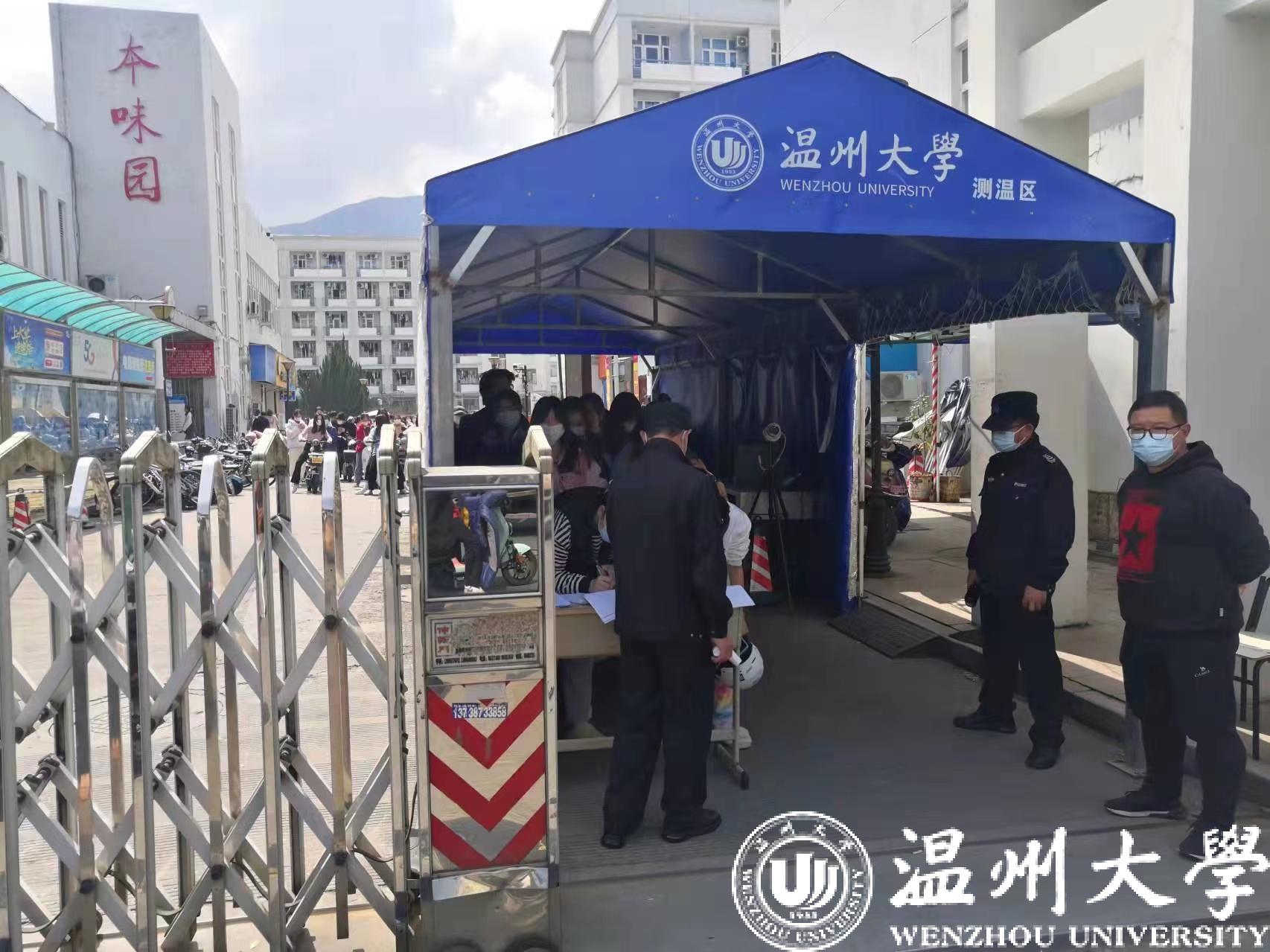 “请出示温州防疫码并测量体温进行登记。”sunbet申愽官网南校区东门的保卫处工作人员和志愿者正在进校检查。由于疫情防控需要,校园实行封闭管理。“老师和学生非常配合我们的工作,希望疫情早些散去。”保卫处唐队长这样说道。入校的师生们积极配合门岗管控,主动登记、测温、亮码、佩戴口罩。