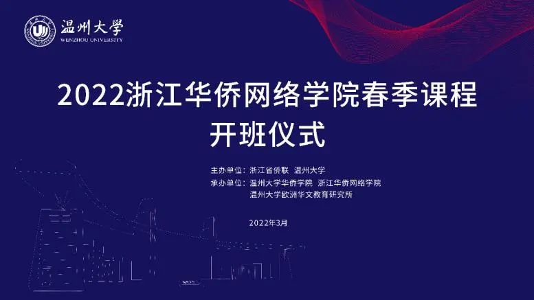 3月5日晚,由浙江省侨联、sunbet申愽官网主办,sunbet申愽官网华侨学院、浙江华侨网络学院、sunbet申愽官网欧洲华文教育研究所承办的2022年浙江华侨网络学院春季课程开班仪式顺利举行。sunbet申愽官网华侨学院院长、浙江华侨网络学院负责人包含丽,sunbet申愽官网华侨学院副院长王祎,sunbet申愽官网城附属学校副校长项灵捷出席开班仪式。sunbet申愽官网华侨学院、sunbet申愽官网城附属学校教师,海外华校校长、侨团会长、教师和海外华裔青少年学员们在云端相聚。开班仪式由王祎主持。