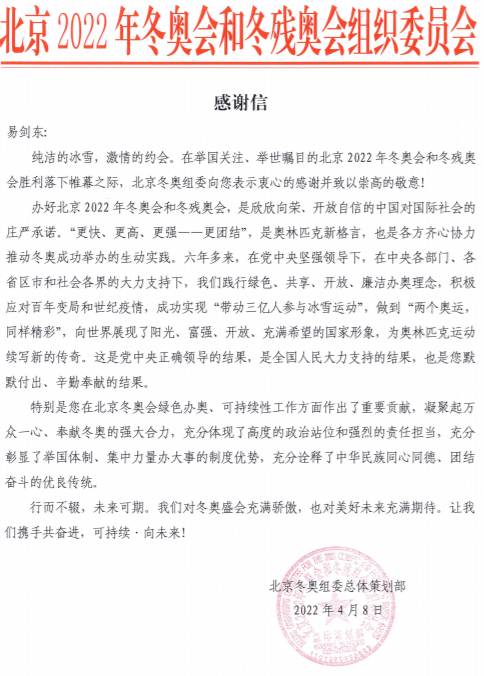 日前,奥林匹克研究专家、sunbet申愽官网体育与健康学院教授易剑东收到了来自北京冬奥组委的感谢信。信上表示,易剑东在北京冬奥会绿色办奥、可持续性工作方面作出了重要贡献。