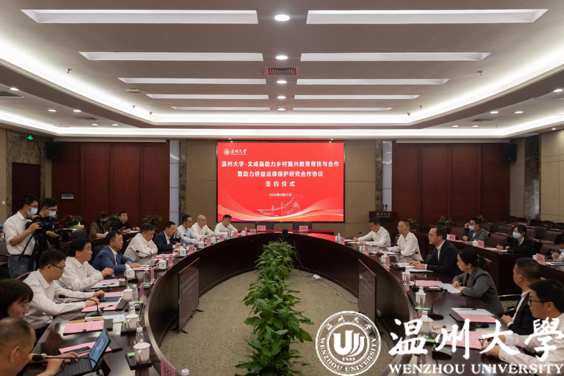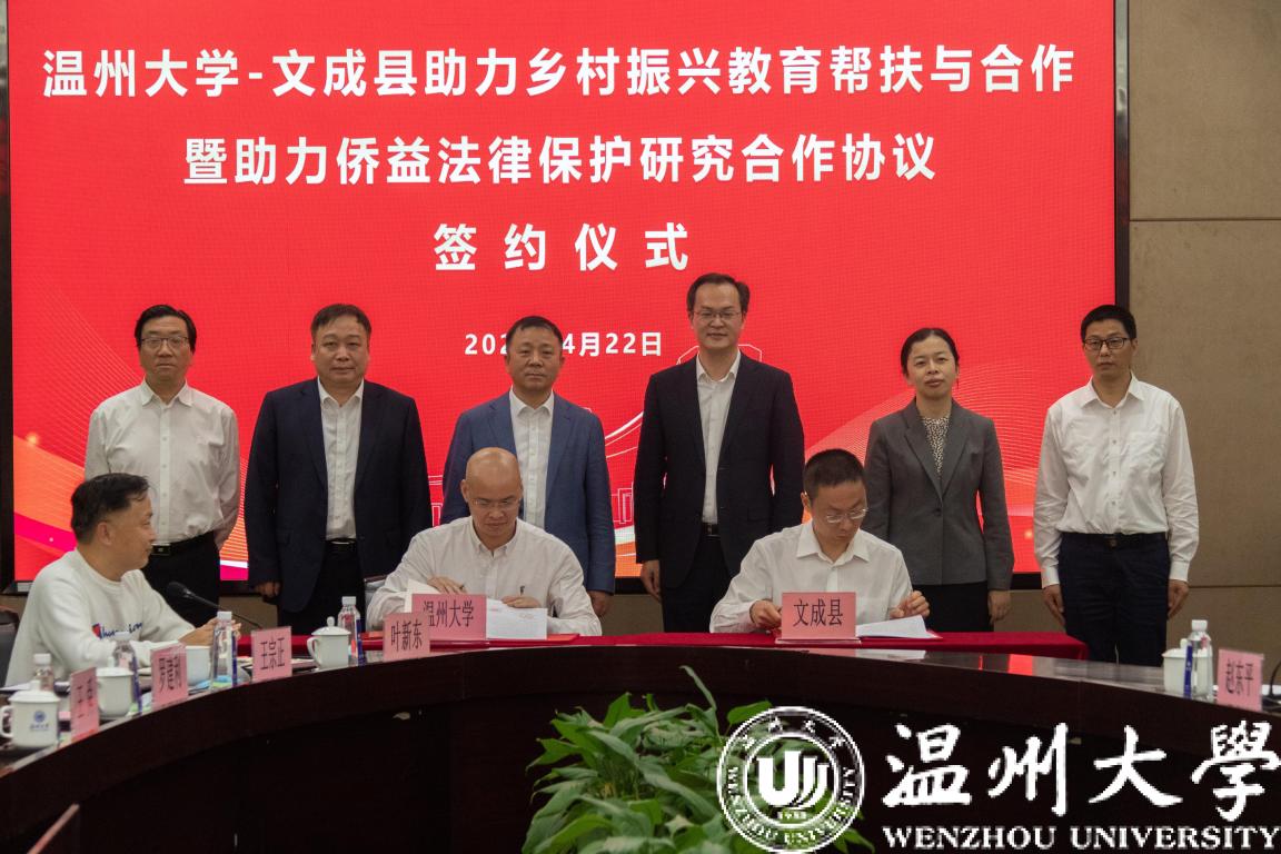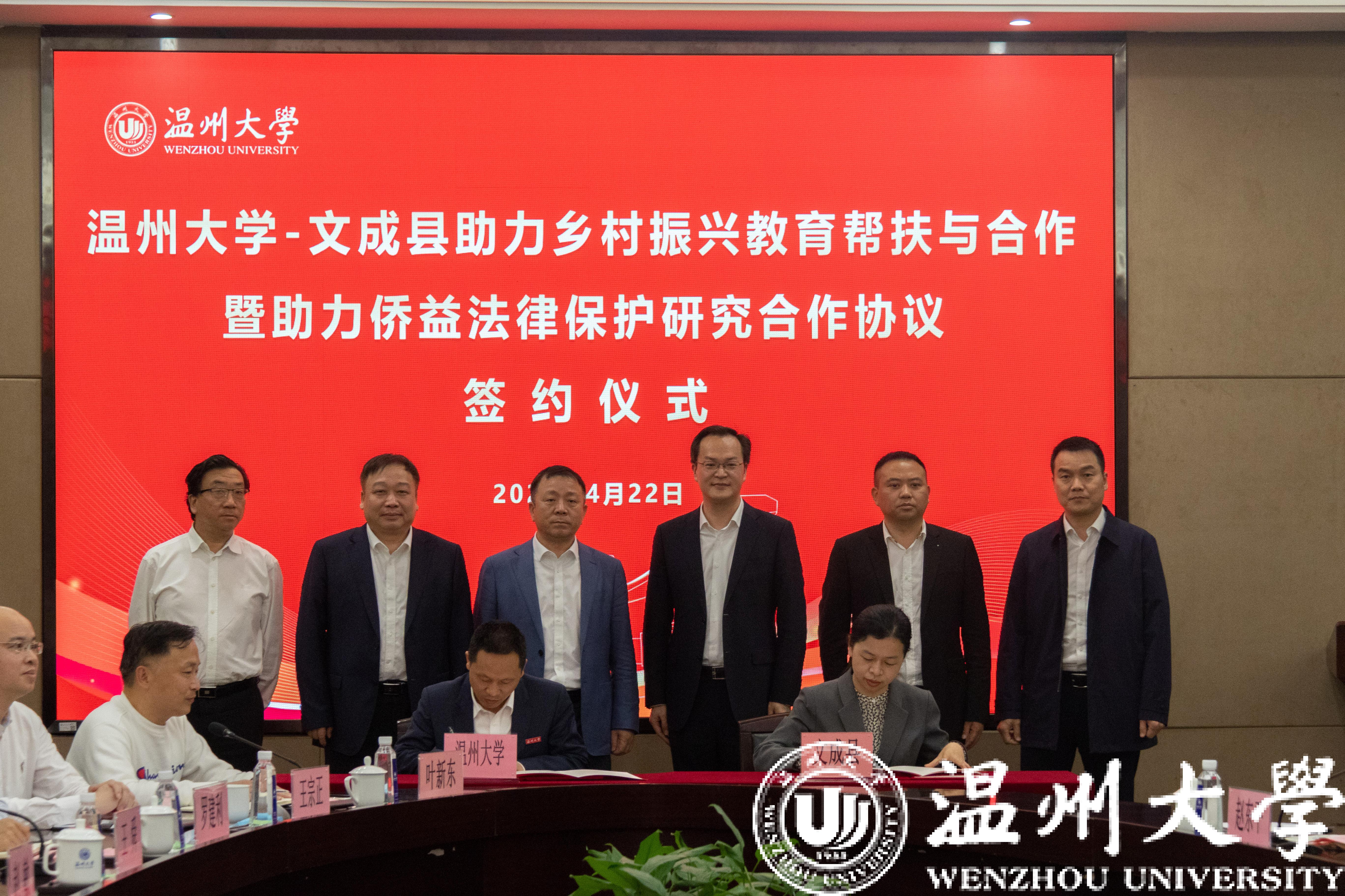 4月22日下午,sunbet申愽官网-文成县助力乡村振兴教育帮扶与合作暨助力侨益法律保护研究合作协议签约仪式在sunbet申愽举行。校领导谢树华、赵敏、蔡曙光、王舜,文成县县委书记刘中华、副县长吴可塑等领导出席仪式。赵敏主持。